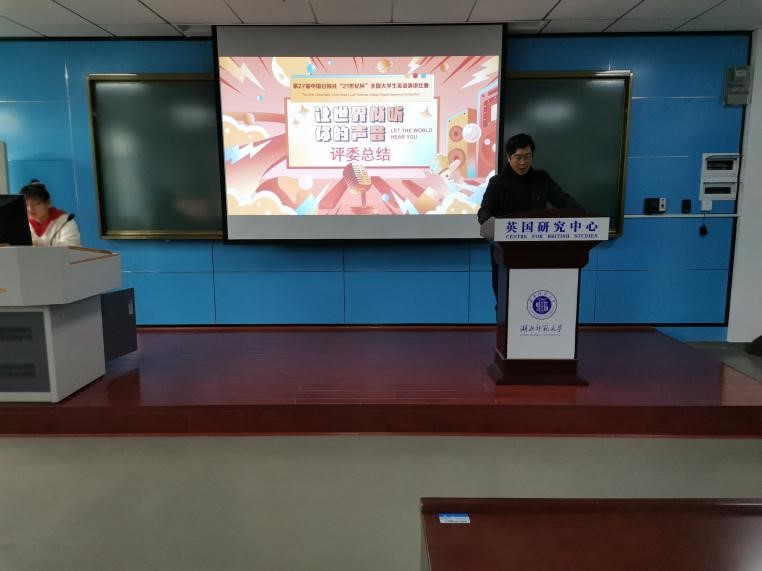 比赛结束之后,副院长龚波教授上台发言致辞。他对现场选手的精彩表现提出了肯定,感谢了李前教授的辛勤指导。但是同时指出选手存在发音不够地道等问题。紧接着,成人短视频 的美国外教老师Paul肯定了选手们的惊艳表现并希望选手们在湖北地区决赛中能像在他的课上一样泰然自若、落落大方,期待选手们能在下一阶段比赛中取得优异成绩。