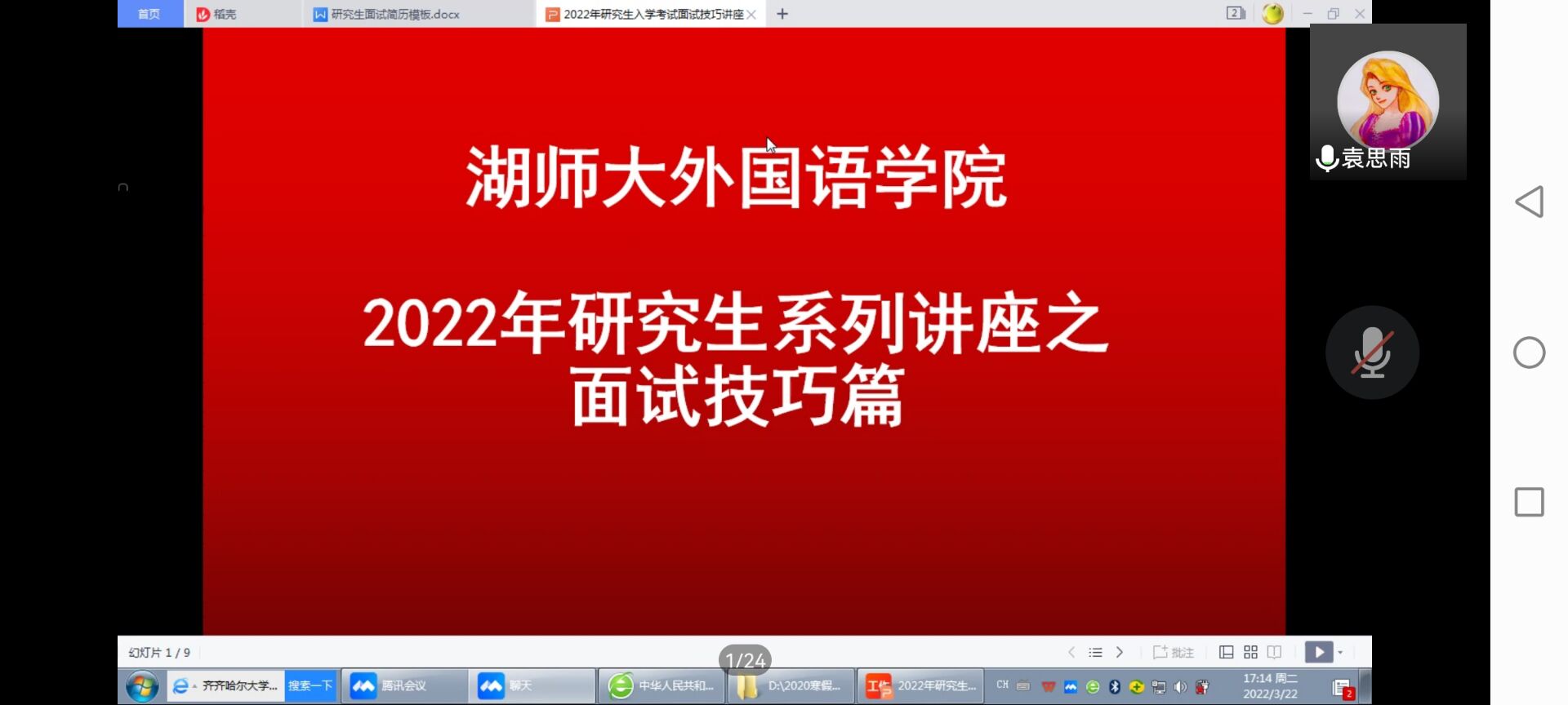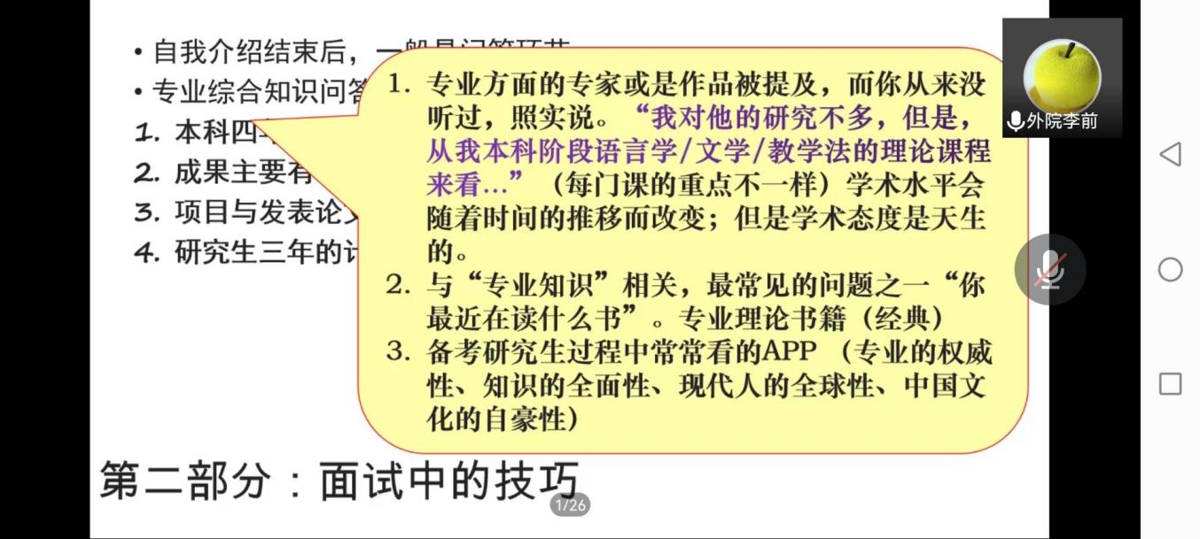 为增强同学们考研复试信心,向即将进行复试的同学们提供指导帮助。成人短视频 于2022年3月22日下午在线上召开了考研复试面试指导会。本次指导会特邀成人短视频 硕士研究生导师李前副教授主讲。此次指导会分为两个环节:面试技巧指导和师生提问交流。