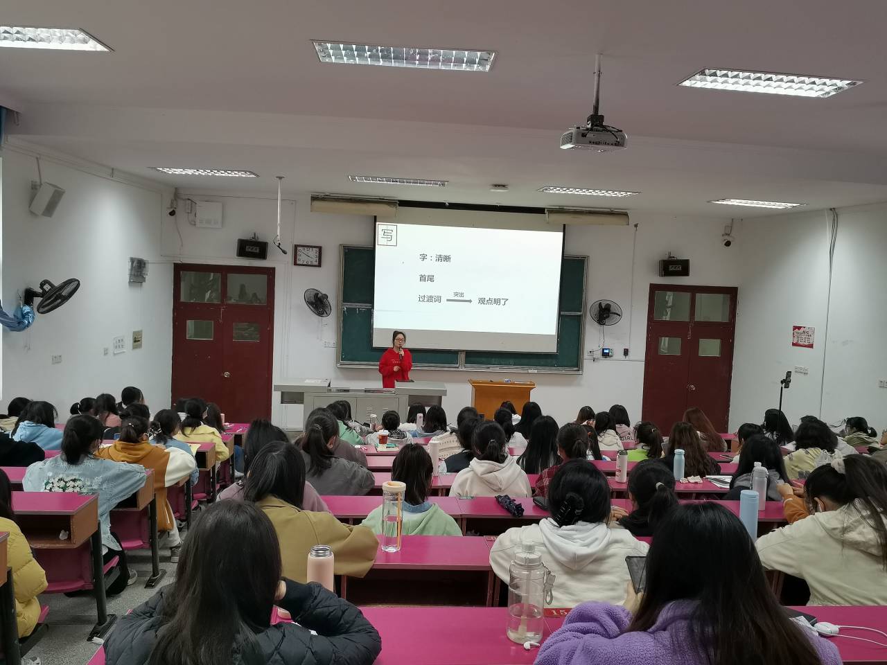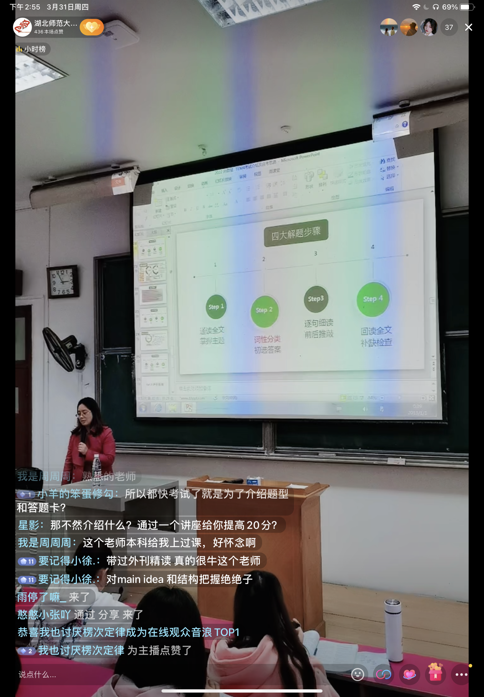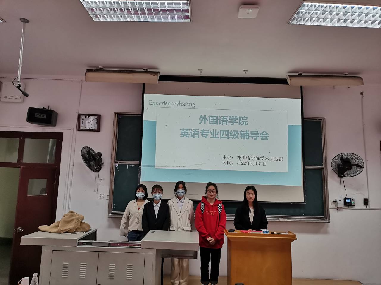2022年3月31日下午14点20分,成人短视频 团总支学术科技部于教育大楼1J22教室举行了2022年英语专业四级考前辅导会,参与此次辅导会的人员为成人短视频 20级全体英专生,本次辅导会的主讲人是具有多年英语专业四级指导经验的向群星老师和1902班的2021年度学习标兵田甜。为响应 成人短视频 疫情防控的相关政策,此次辅导会在抖音平台同步直播。