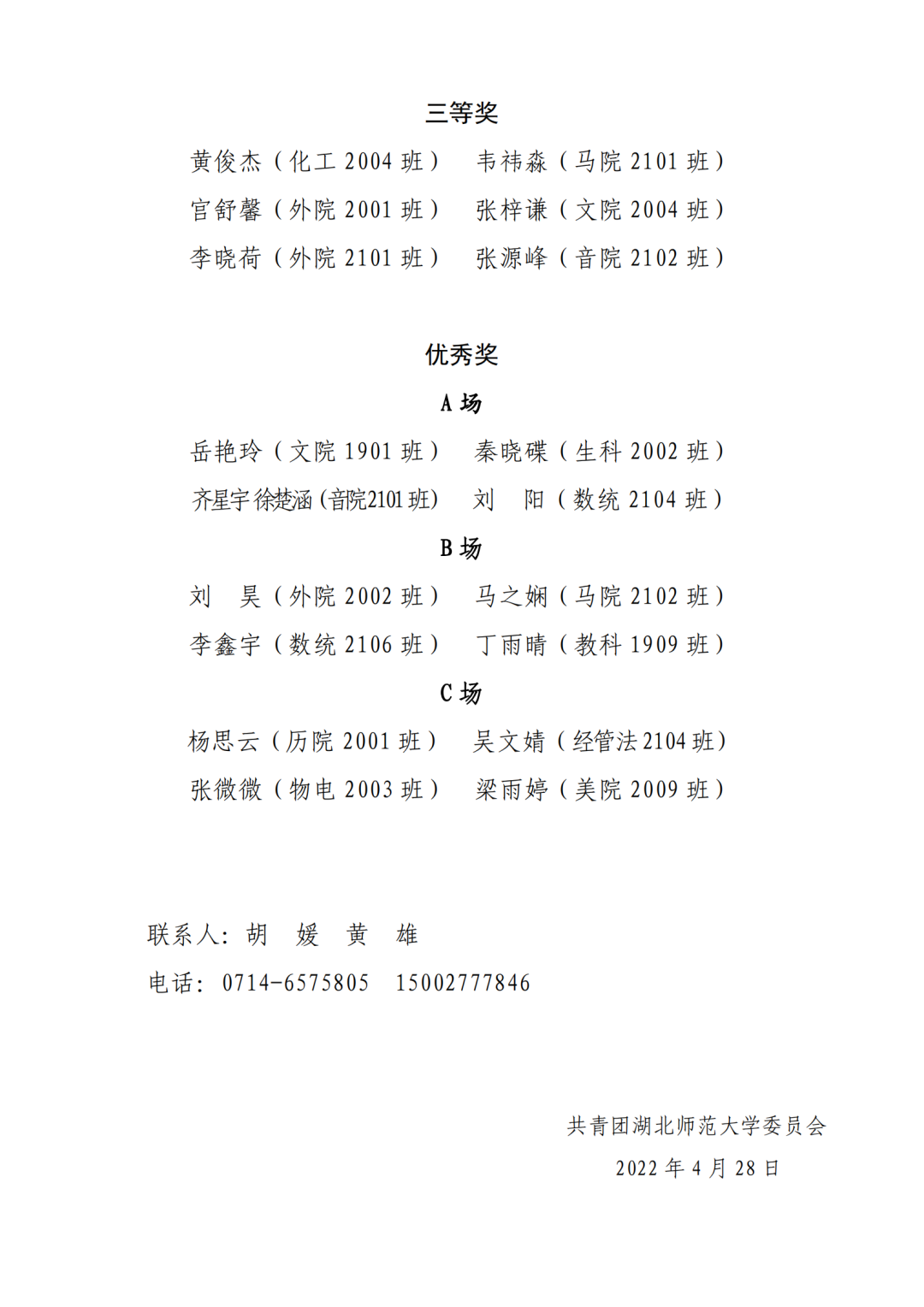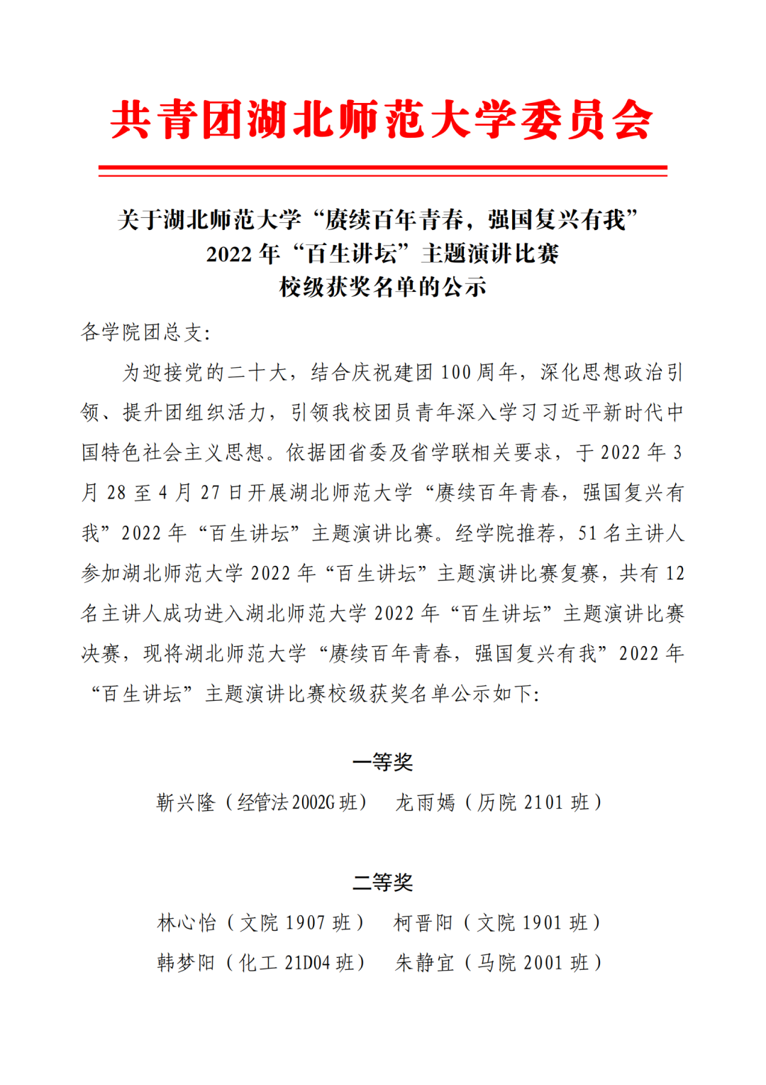 为庆祝中国共青团百年华诞,提高广大湖师青年的思想政治水平,在全校团学组织中持续深化“百生讲坛”——学习宣传贯彻习近平新时代中国特色社会主义思想活动,4月27日晚, 成人短视频 在教育大楼报告厅举行了以“赓续百年青春,强国复兴有我”为主题的“百生讲坛”演讲比赛。经层层评选,外院入围决赛并取得优异成绩:2001班宫舒馨、2101班李晓荷荣获三等奖!