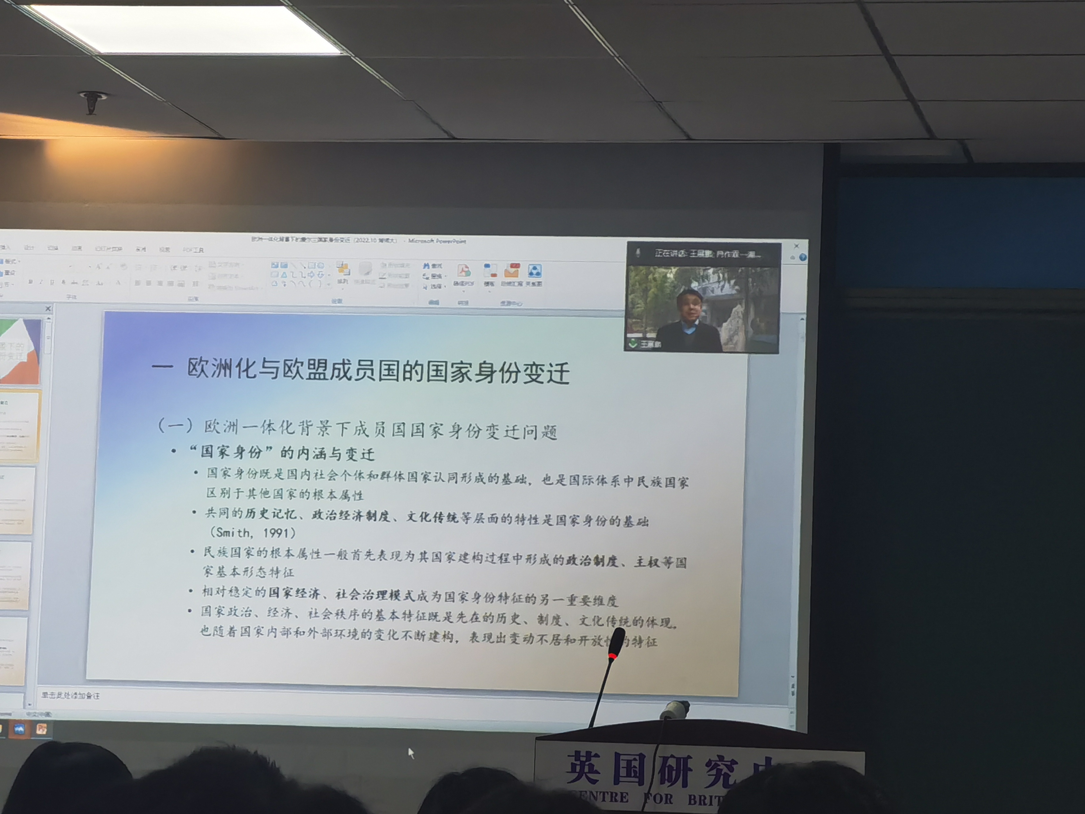 为营造浓厚科研氛围,鼓励广大教师加强学术交流,产出更多科研成果, 成人短视频 和英国研究中心于2022年10月23日开展了“磁湖学术活动日——磁湖讲堂”系列活动。北京外国语大学英语学院副院长、博士生导师王展鹏教授,通过腾讯会议平台作了题为“欧洲一体化背景下的爱尔兰国家身份变迁”的第一场学术讲座。本次讲座由成人短视频 副院长南潮教授主持,成人短视频 院长丰国欣教授、成人短视频 部分教师和硕士研究生聆听了本次讲座。