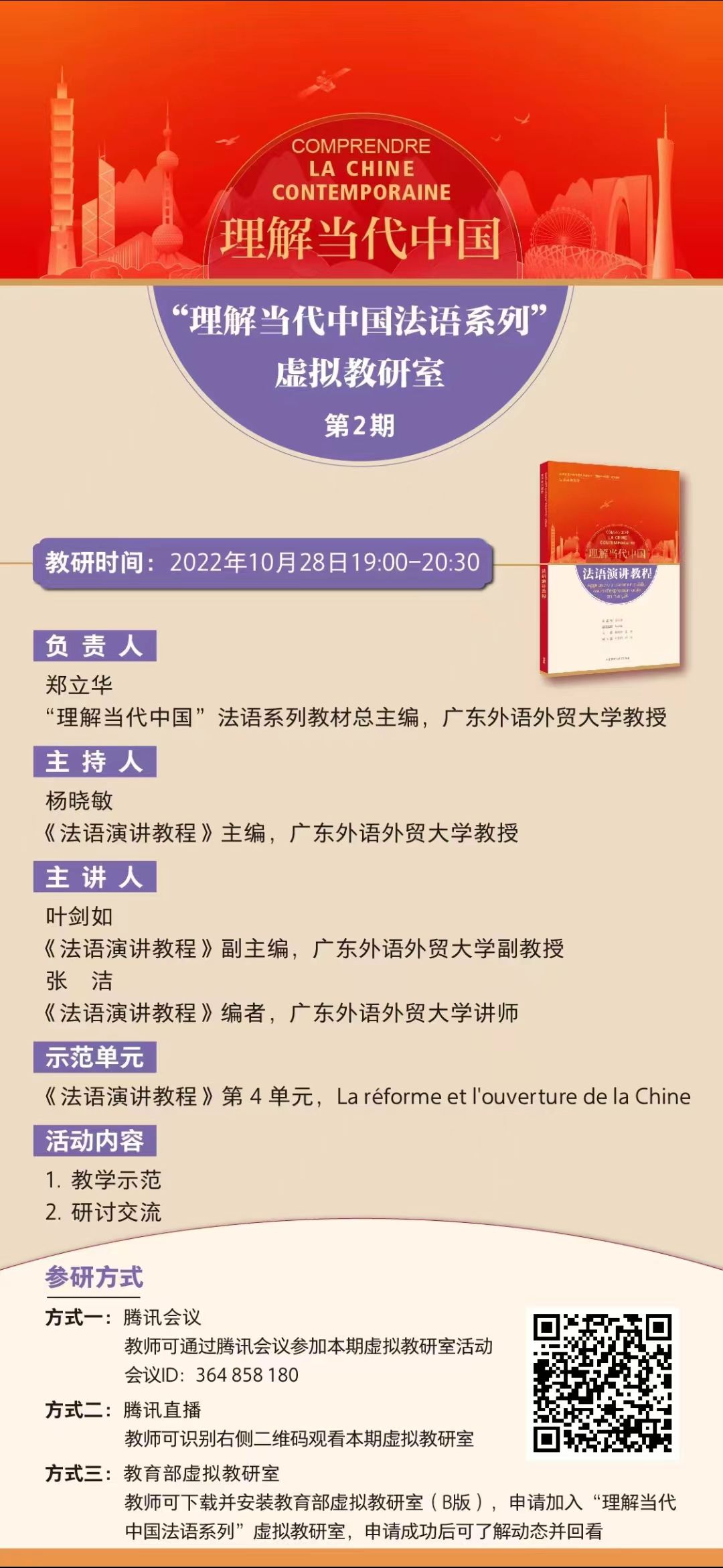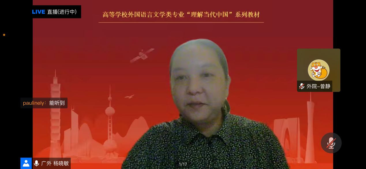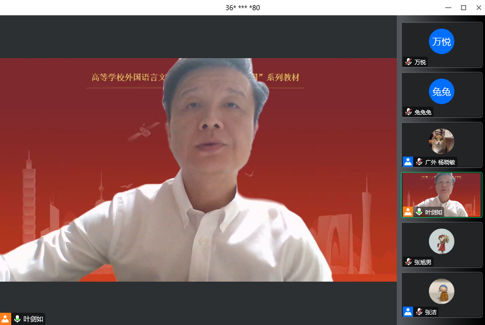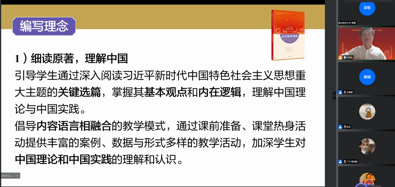 此次虚拟教研室活动由《理解当代中国法语系列教材》总主编、广东外语外贸大学郑立华教授负责,《法语演讲教程》主编、广东外语外贸大学杨晓敏教授主持,广东外语外贸大学的叶剑如副教授和张洁讲师担任主讲。