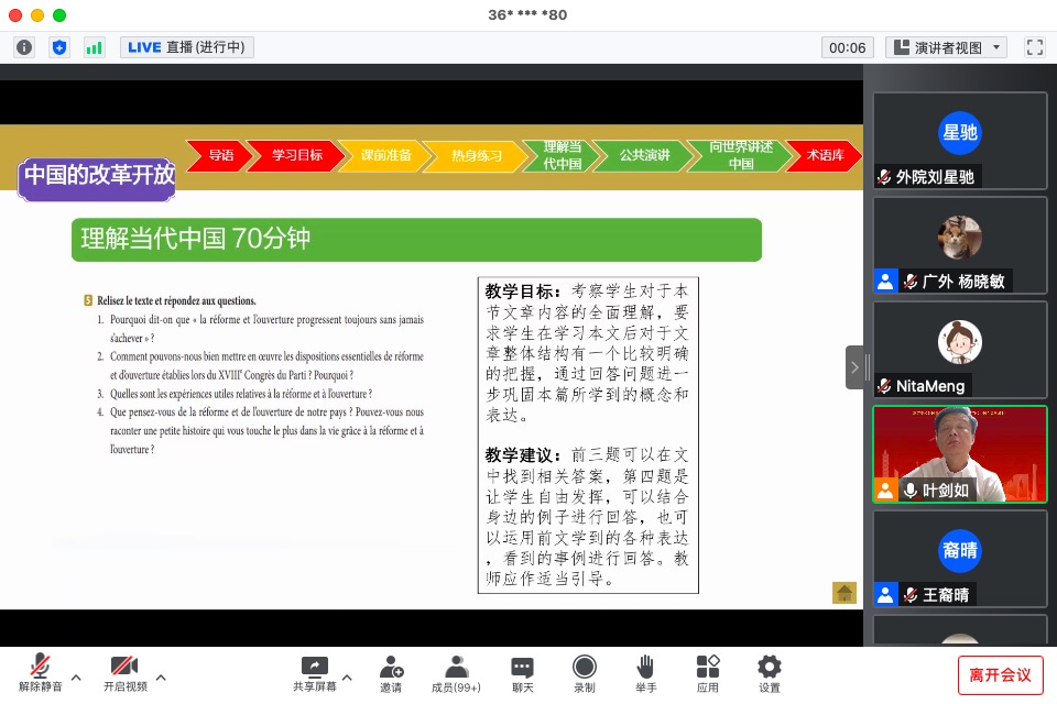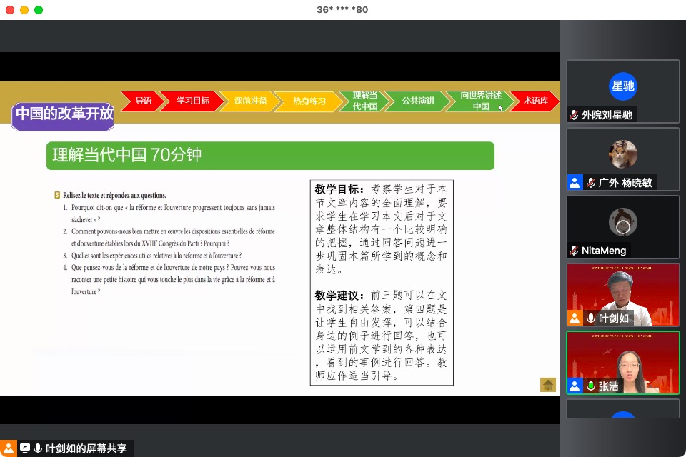 线上教研活动很好地体现了《理解当代中国》系列教程强调四个自信、讲好中国故事的意图。教材在选编、课程安排等方面都体现出中国文化的强大生命力、中国政治的独特优势以及当代中国人良好的精神风貌。本次教研活动示范的单元是《法语演讲教程》的第四单元,La réforme et l’ouverture de la Chine.讲解章节有关于中国的改革开放。课程叙述了新中国改革开放的壮举和取得的辉煌成果。经过这一次活动,老师们关于『向世界讲述中国』、『演讲术语库』等关键信息有了更深刻的理解。