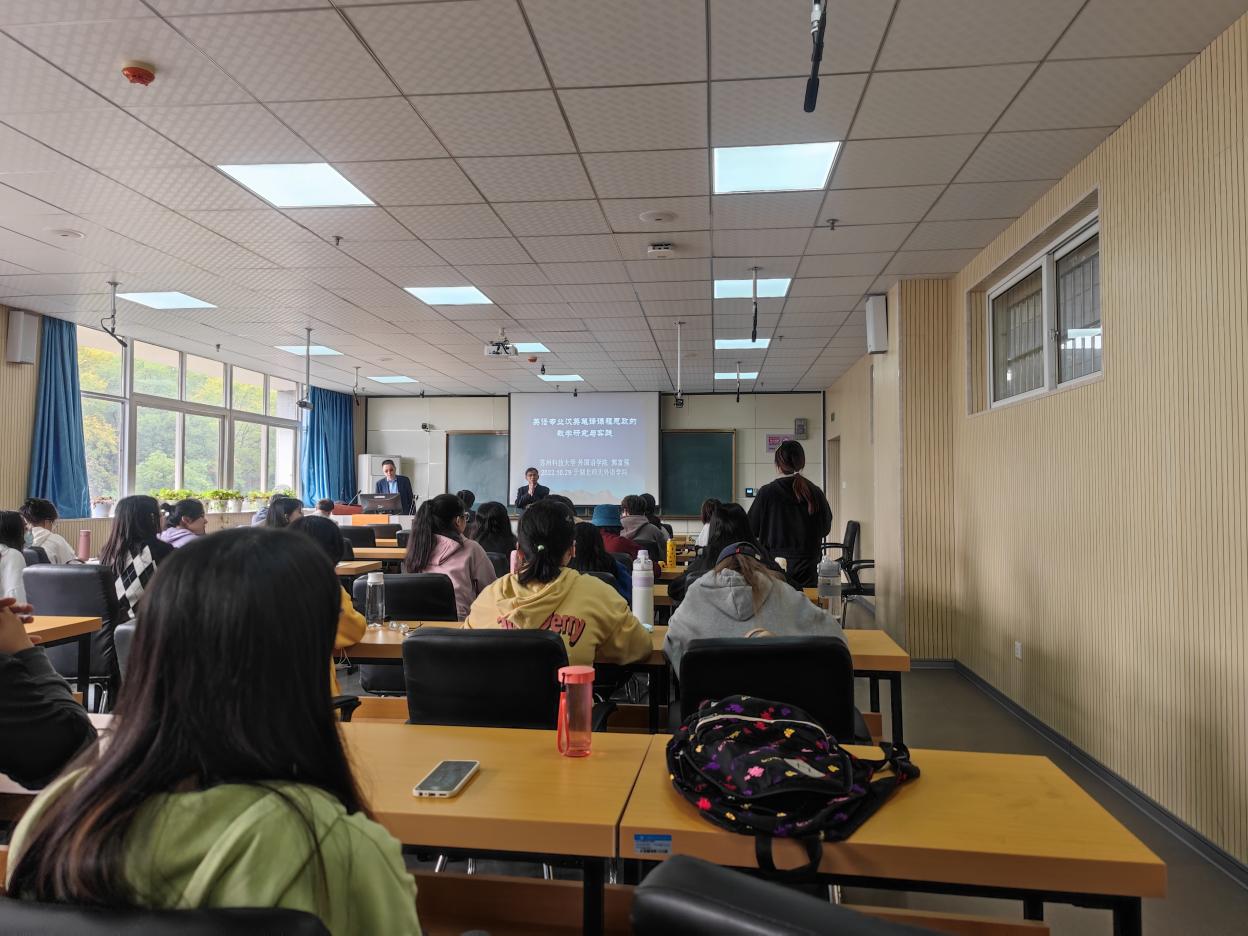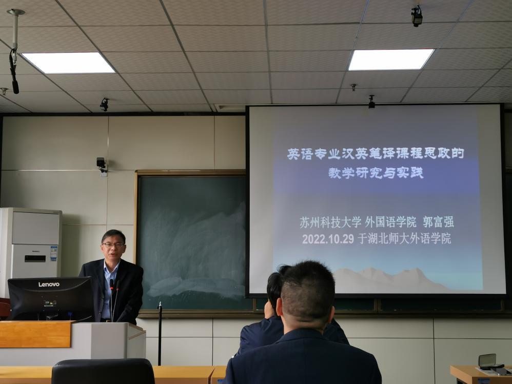 为进一步加强广大师生的学术交流,营造浓厚的学术氛围,苏州科技大学成人短视频 郭富强教授于2022年10月29日应邀在21B602为 成人短视频 师生做了以“英语专业汉英笔译课程思政的教学研究与实践”为题的线下学术讲座。本次讲座由成人短视频 副院长南潮教授主持,成人短视频 院长丰国欣教授、成人短视频 部分教师和硕士研究生聆听了本次讲座。