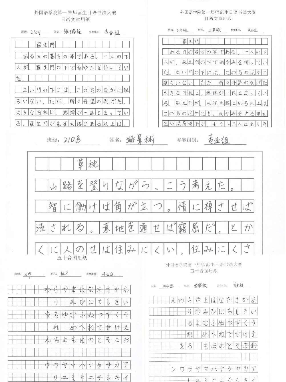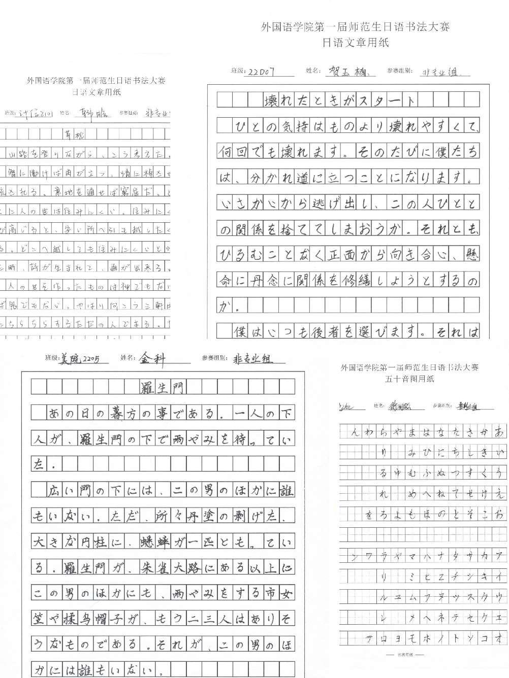 此次比赛同学们踊跃参与,表现出了极大的学习热情。同时也展示出了师范专业同学们良好的书写功底。是对日语书写能力的一次有效检验,也是营造师范专业技能训练的一次积极尝试。今后我们还将继续开展师范生技能培养系列活动。将师范教育持续开展下去。
