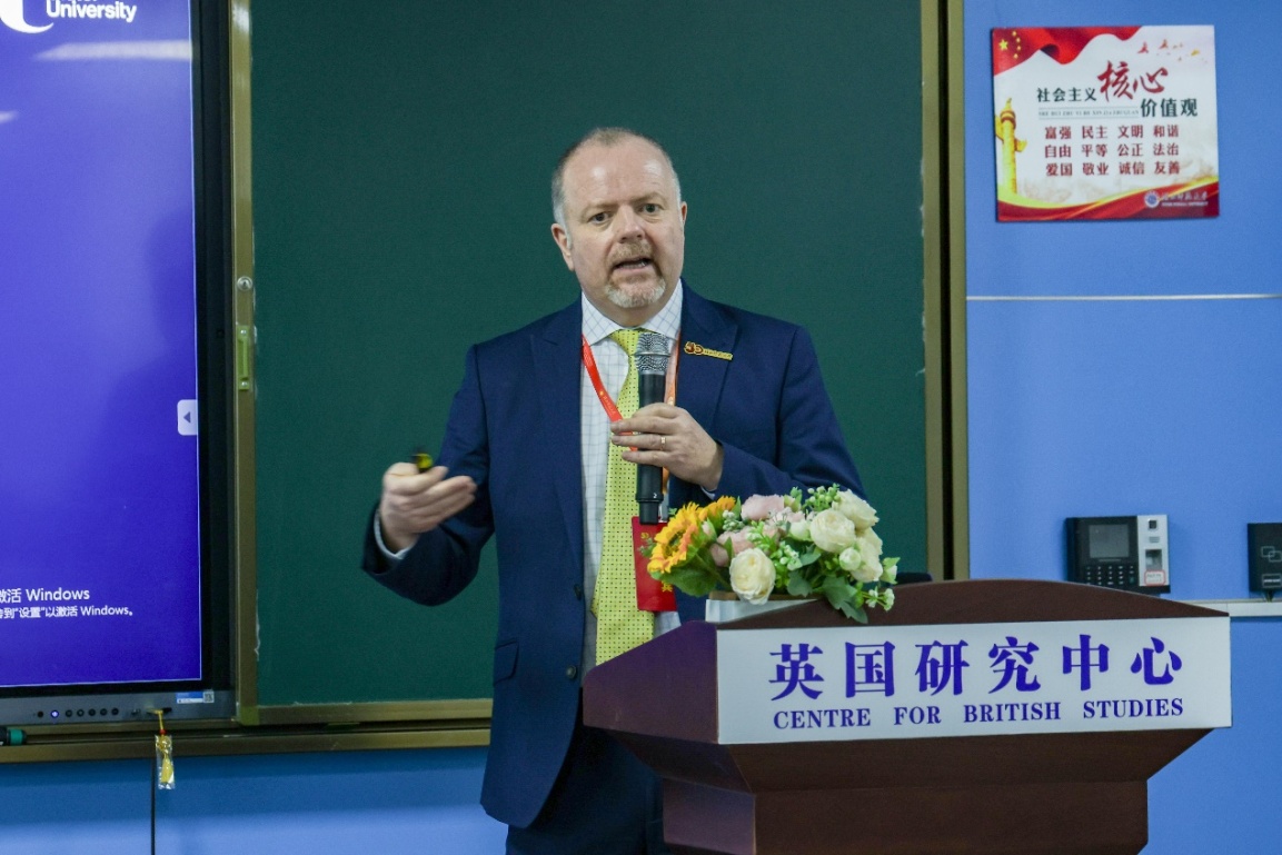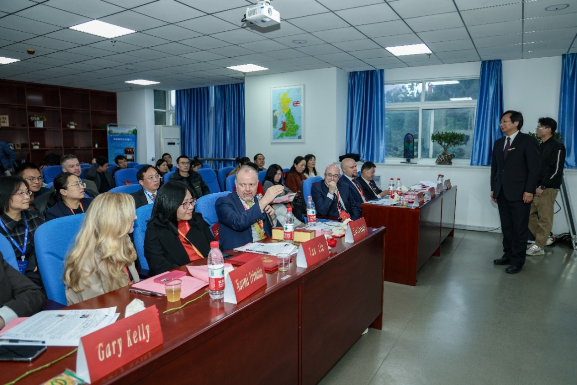 11月18日下午,作为学校校庆活动之一,成人短视频 校庆系列活动之“国际外院:中英人文交流论坛”在成人短视频 英国研究中心21B404隆重举行。英国北爱尔兰弗马纳市市长、圣凯文学校理事会理事长Hugh Thomas O'Reilly一行11人、成人短视频 副校长余翔、党委常委肖六亿及各部门、各学院师生代表等中方人员40余人参加了这次论坛。此次论坛聚焦中英两国人文交流,旨在促进两国之间的深入理解和友好关系。