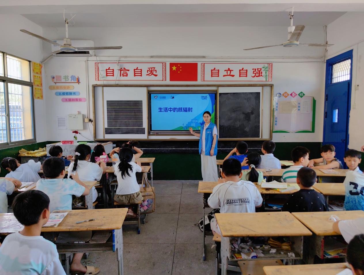 在梁公铺完全小学,实践队带队老师罗兰采用了更加生动的教学方式。黑板变成了一幅“核技术生活地图”:辐照保鲜的阳新脐橙、同位素育种的优质水稻、防疫包里的核酸检测试纸……她用身边可见的例子,让科普课生动易懂,四年级的孩子们在“我想发明的核技术”专栏里,天马行空地写下“会发光的跳绳”“永远保鲜的饭盒”等奇思妙想。