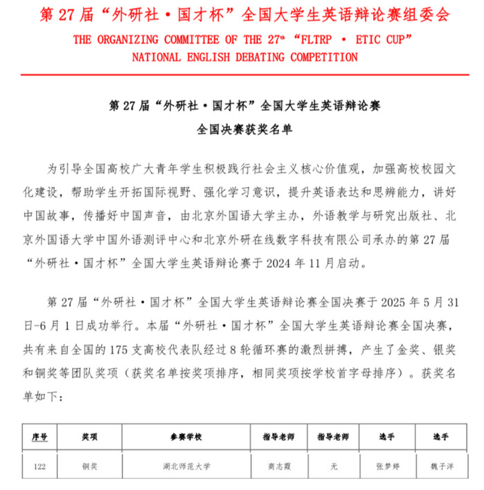 思维碰撞世界,语言绽放光芒。在2025年4月至6月举行的第27届“外研社·国才杯”全国大学生英语辩论赛中, 成人短视频 成人短视频 2022级英语专业学生魏子洋、张梦婷凭借扎实的语言功底与出色的思辨能力,从华南赛区激烈角逐中脱颖而出,斩获复赛金奖,并最终在全国决赛中夺得铜奖,展现了 成人短视频 学子的卓越风采。