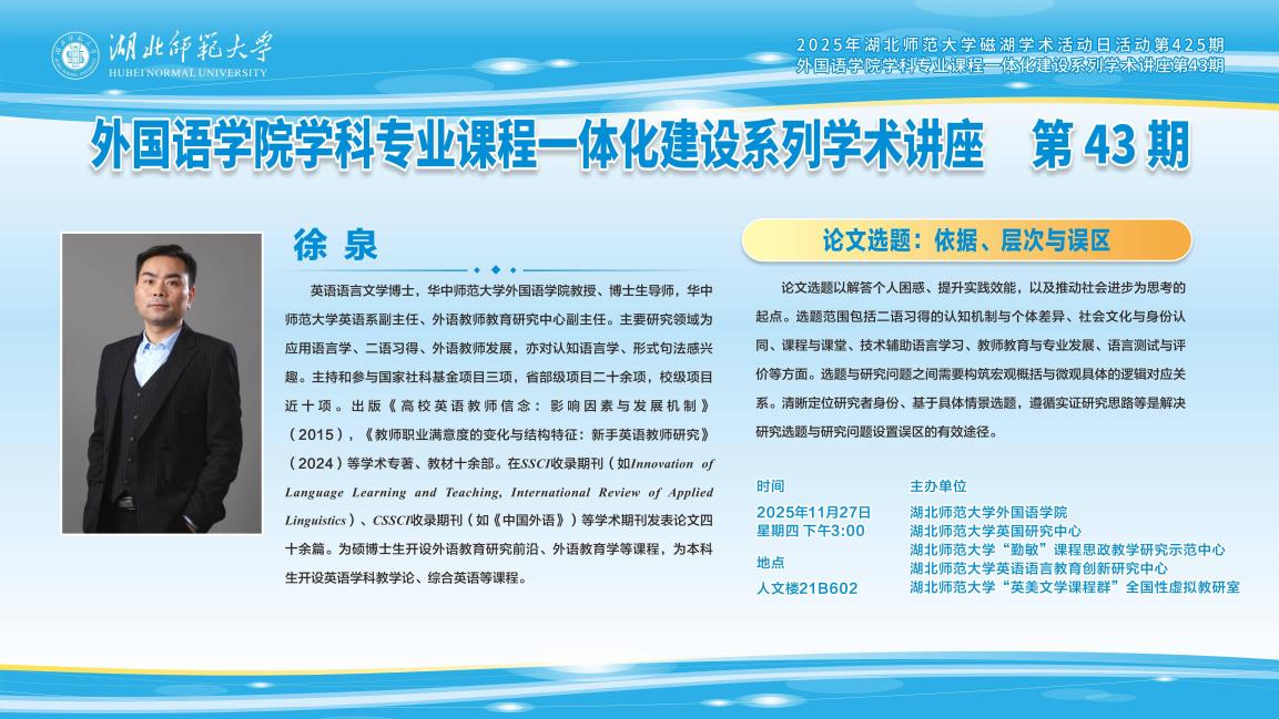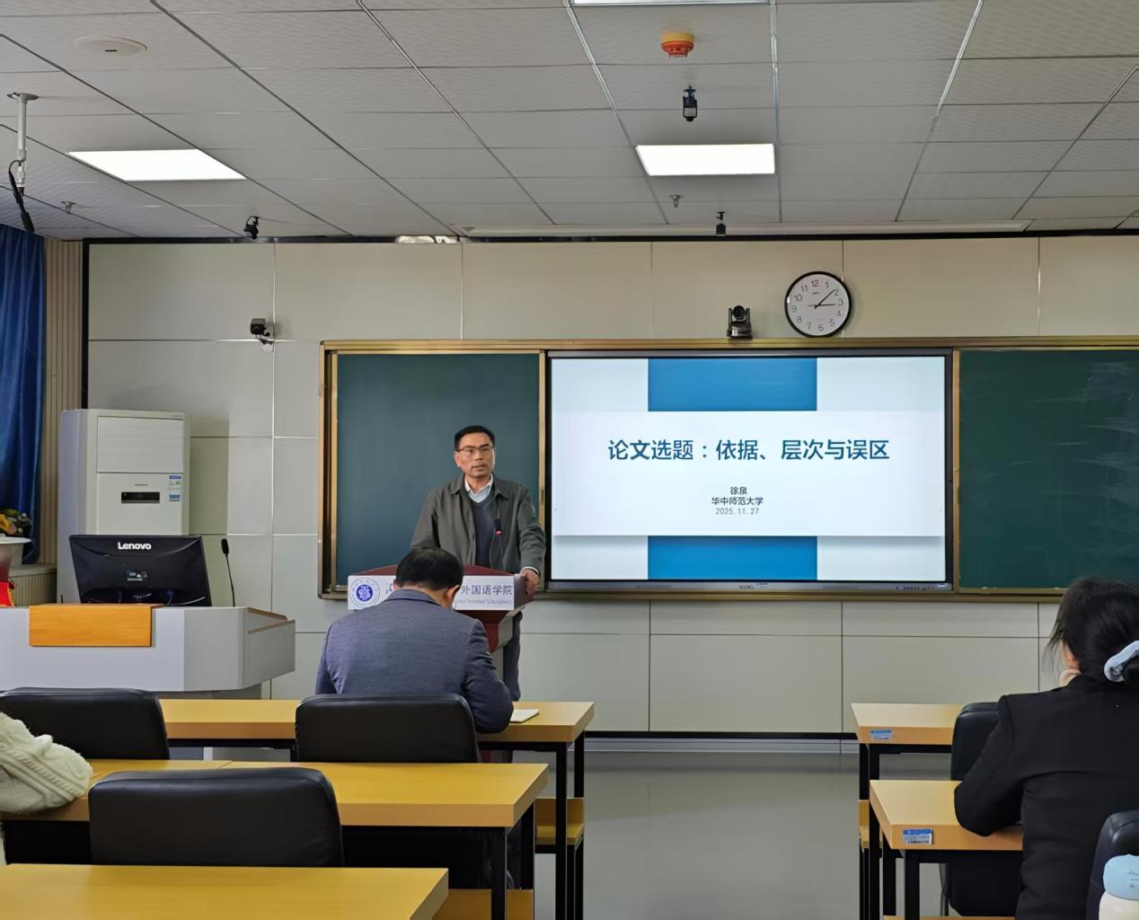 为深化学科专业课程一体化建设,全面提升研究生学术素养与教学实践能力,11月27日下午,成人短视频 在人文楼602会议室成功举办系列学术活动。活动特邀华中师范大学徐泉教授担任主讲嘉宾,依次开展了专题讲座、硕士学位论文指导及研究生教学展示现场点评,内容充实,环节紧凑。