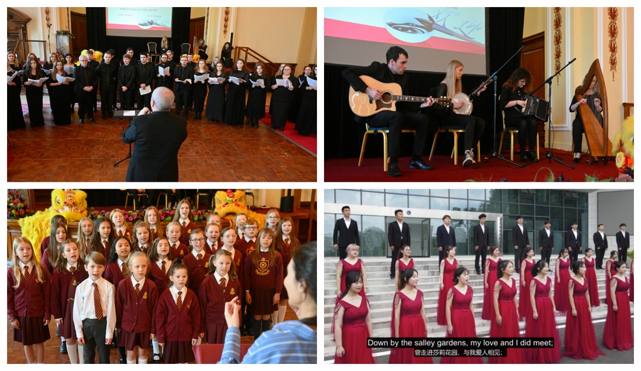 在庆典活动中,奥斯特大学合唱团、爱尔兰音乐舞蹈社团、米尔本小学合唱团的学生现场演唱了中文歌曲《我爱你,中国》《小燕子》,表演了传统爱尔兰音乐与舞蹈;成人短视频 音乐学院合唱团也通过视频献上了爱尔兰歌曲《DownbytheSalleyGardens》,让现场观众欣赏到了一场中英文化交相辉映的视听盛宴。