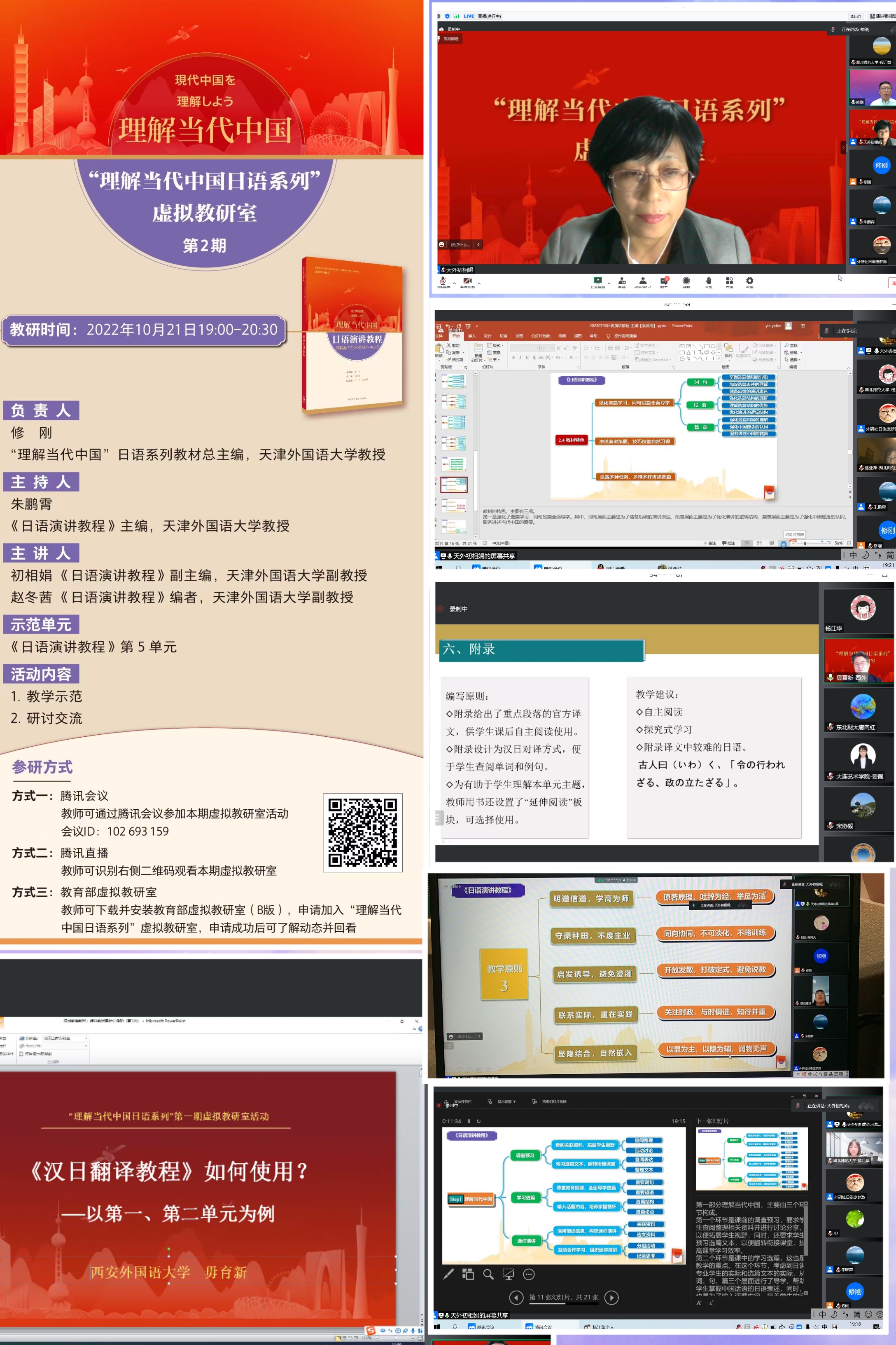此次虚拟教研室活动由《理解当代中国.日语演讲教程》总主编天津外国语大学朱霄鹏教授主持,教材副主编天津外国语大学初相娟和赵冬茜两位老师担任主讲。