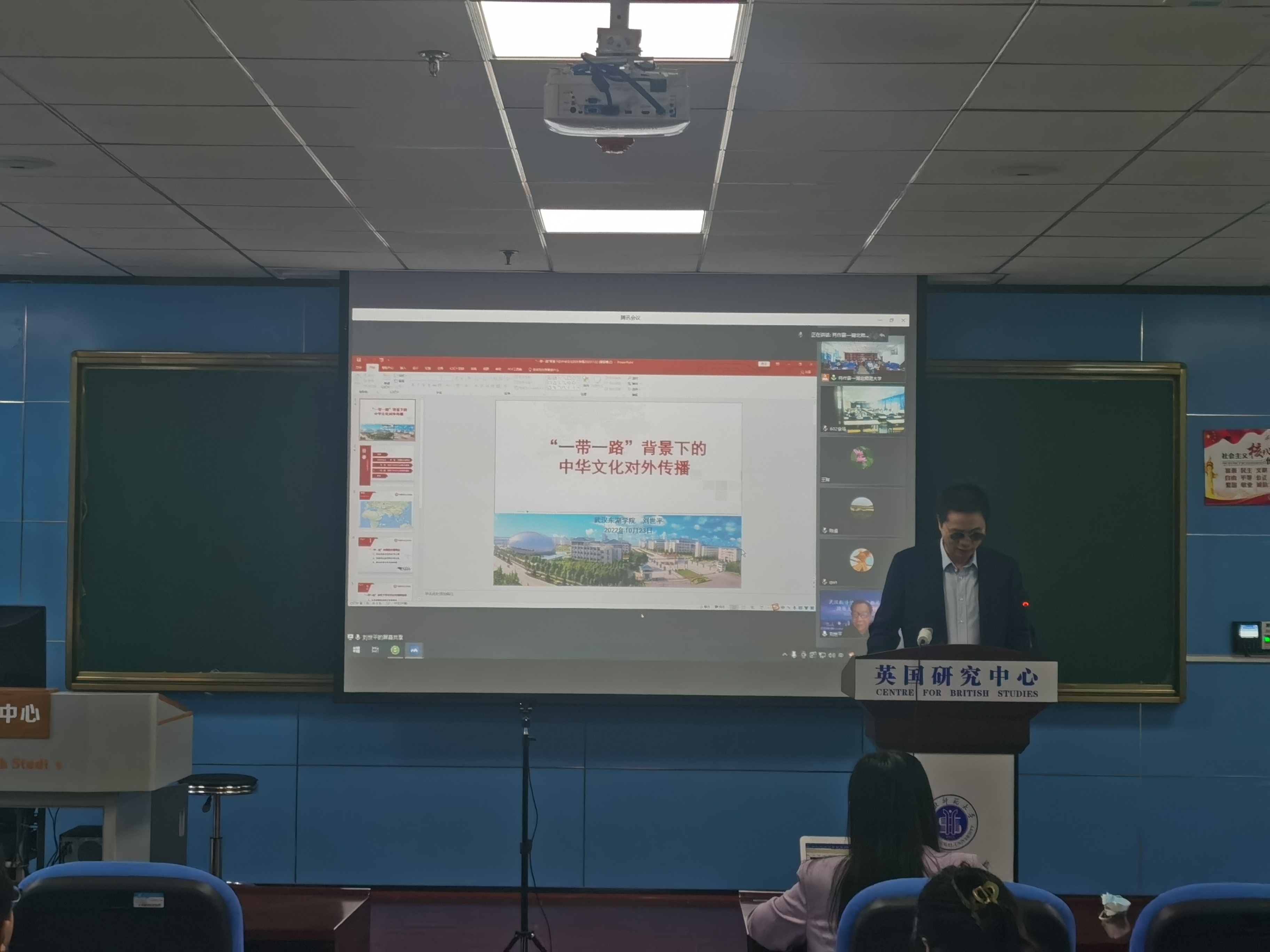 为营造浓厚学术氛围, 成人短视频 和英国研究中心于2022年10月23日开展了“磁湖学术活动日——磁湖讲堂”系列活动。武汉大学教授、武汉东湖学院外语学院院长刘世平教授作了题为““一带一路”背景下的中华文化对外传播”的学术讲座。本次讲座由成人短视频 副院长南潮教授主持,成人短视频 院长丰国欣教授、成人短视频 部分教师及硕士研究生聆听了本次讲座。