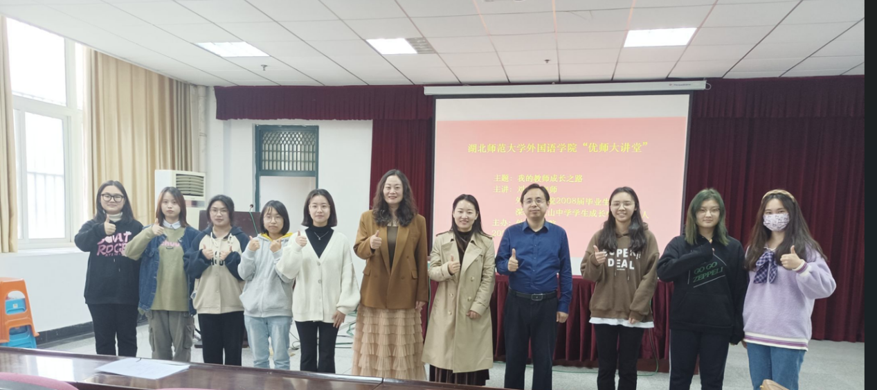 2023年3月11日上午,为强化英语专业“优师计划”师范生的教育情怀和实践创新能力,实践“名师传帮带”的师范生培养机制,成人短视频 “优师大讲堂”在信息大楼二楼报告厅举行。 成人短视频 英语专业优秀校友,深圳市教学名师刘米竹老师受邀为全体师范生作了《我的教师成长之路》主题讲座。成人短视频 党委书记王海燕、党委副书记曹小为、教学副院长龚波、英语系主任朱勇进、综合英语教研室主任、优师计划2101班班主任唐凤华、辅导员杨梦伟、外语学院全体“优师计划”师范生、英语专业师范生代表出席了此次活动。讲座由朱勇进主任主持。