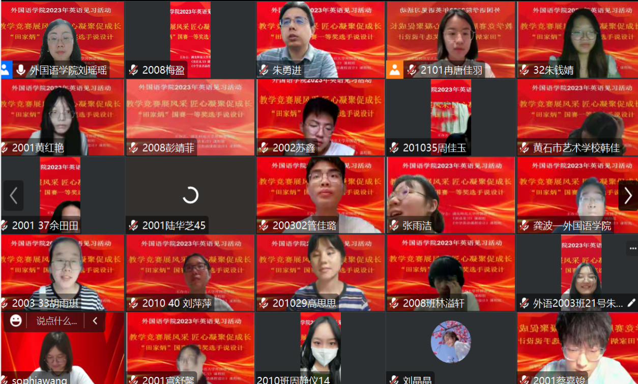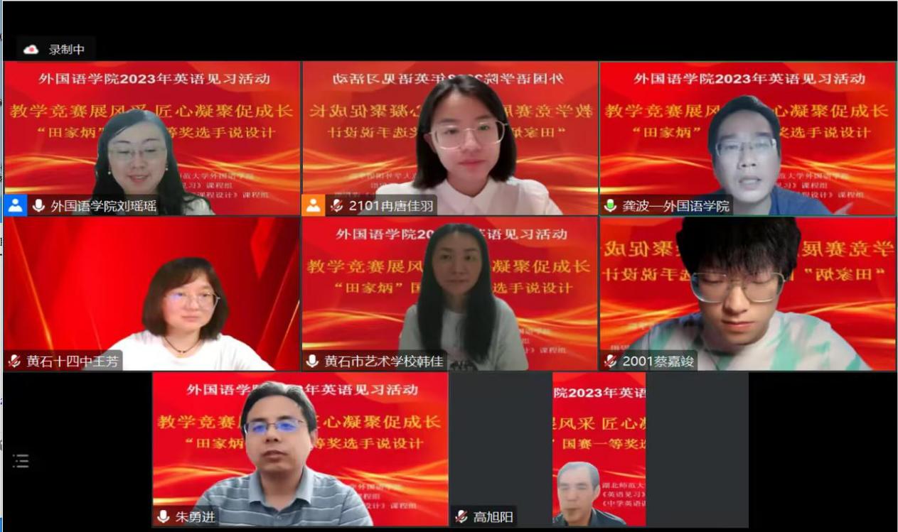 成人短视频 连续三年蝉联“田家炳”杯全国师范生教学技能竞赛一等奖,为了提高成人短视频 英语师范生的综合教育素质和从师任教能力,鼓励更多的同学参与教学技能大赛,以赛促学,以赛促建,成人短视频 于5月28日在腾讯会议举办了以“教学竞赛展风采,匠心凝聚促成长”为主题的第二次线上教育见习活动。此次活动邀请了荣获“田家炳”国赛一等奖的蔡嘉竣同学分享他从院赛、校赛,省赛到国赛每次都荣获一等奖的心路历程和参赛的教学设计。参加此次活动的有成人短视频 副院长龚波,成人短视频 教学督导高旭阳,成人短视频 英语系主任朱勇进,成人短视频 语言学教研室主任刘瑶瑶,成人短视频 师范生兼职导师黄石十四中英语教研组组长王芳和黄石艺术学校教师韩佳,以及2020级全体师范英语专业学生和2023年成人短视频 教师技能大赛复赛的选手。本次活动由英语见习、中学英语课程教学设计等课程负责人刘瑶瑶老师组织实施。