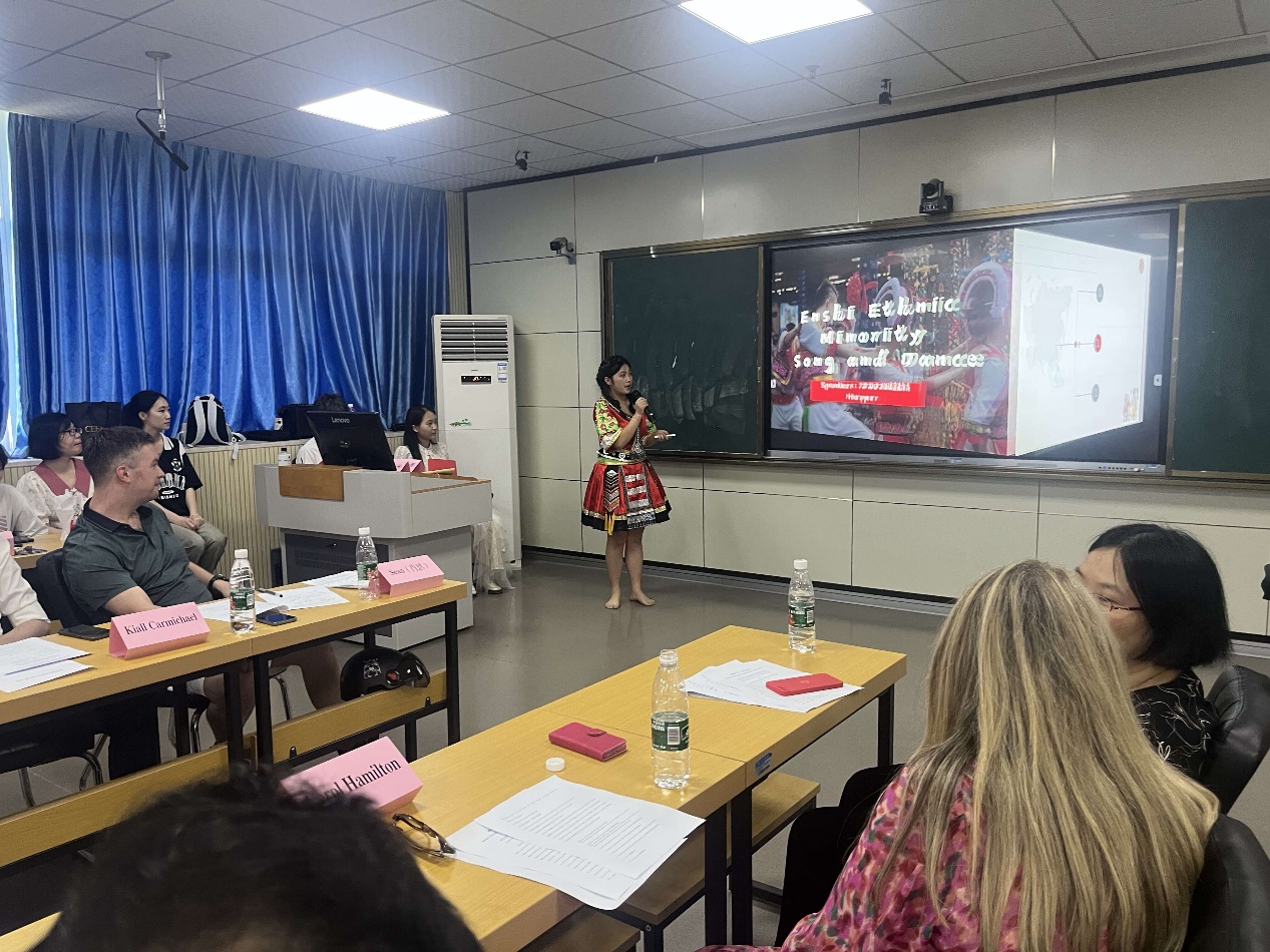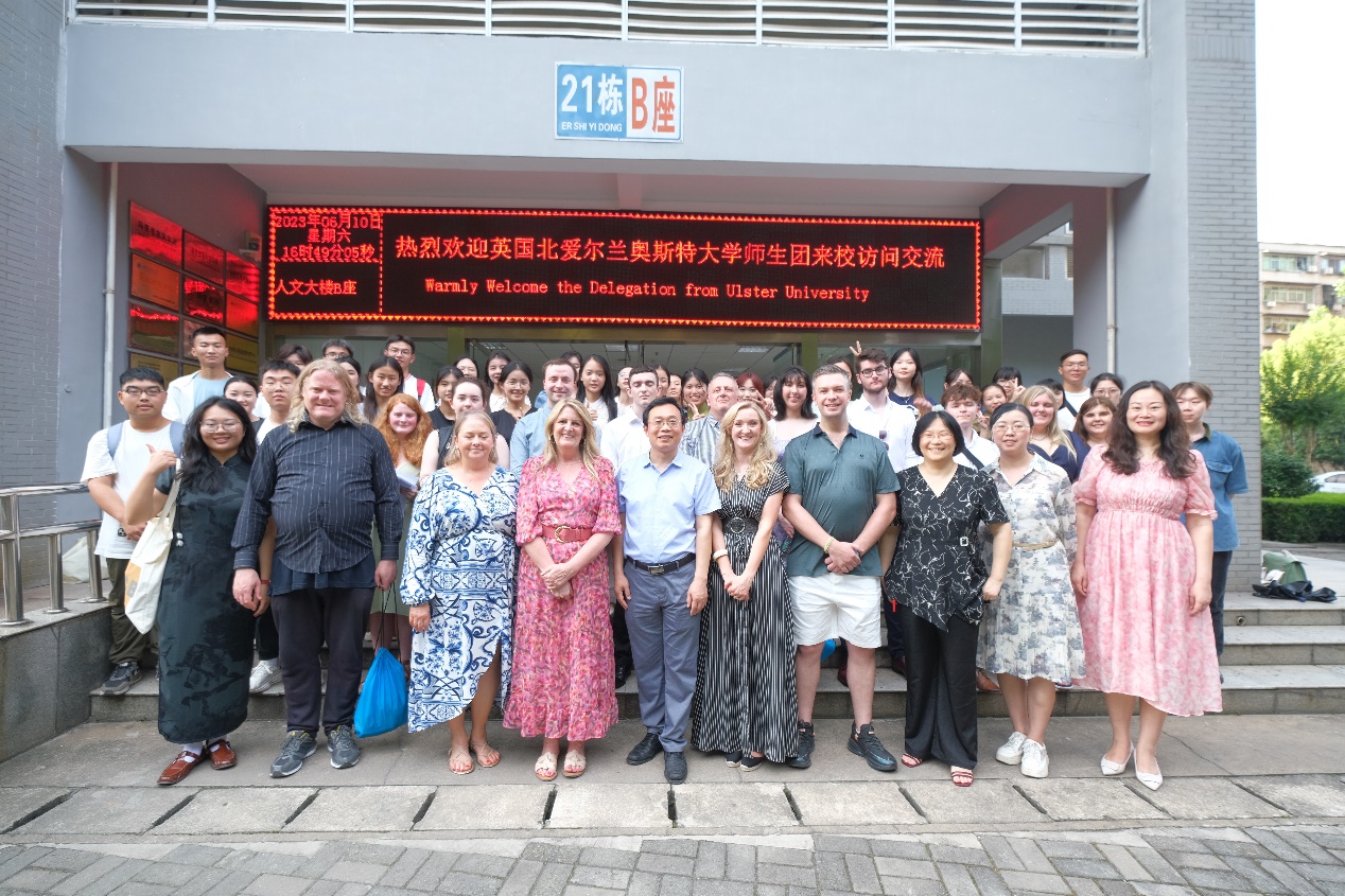 活动伊始,主持人李丽珊、刘显州让参加交流活动的中英双方人员轮流自我介绍。随后,成人短视频 副院长项军平对来访的奥斯特大学师生表示热烈的欢迎,并向他们简要地介绍了成人短视频 情况。奥斯特大学教师Ms.Tracey Margaret McAllister也进行了发言,她代表来访师生对 成人短视频 的热情接待表示感谢,他们都深深地感受到中国人民的友善和热情,对中国的发展感到震撼,并对接下来为期两周的中国之行充满了期待。接着,成人短视频 学生代表詹玒奕、熊茹月、张梦婷、欧睿哲、张罗镱五位同学分别以“我的校园生活”、“我的国际交流”、“中国传统服饰发展简史”、“中国美食”和“端午节”为主题作了文化展示,五人讲解风格各异,但讲解内容都清晰易懂、生动有趣,使英国师生对中国文化产生了浓厚的兴趣。同时,2202班颜靖同学身着民族服饰,介绍了恩施土家族文化,表演了具有民族特色的舞蹈,成为全场焦点。奥斯特大学两名学生Liam Bailey和Kiall Carmichael也先后发言,他们对 成人短视频 的热情接待表示感谢,并表示对中文和中国文化非常感兴趣。他们来中国前已经参加了汉语水平考试,他们表示今后会继续认真学习中文。我们学院聘请的来自北爱尔兰的外教肖恩也分享了他在湖师的工作和生活,并与外院同学一起合唱了中国歌曲《最炫民族风》,赢得了全场热烈的掌声。2111班的徐詹萌同学也演唱了一首英文歌曲。文化展示结束后,双方师生进一步展开了讨论交流,双方学生就相关问题进行提问,并回答对方学生的问题。最后,双方同学自由交流,一起拍照并全体合影。