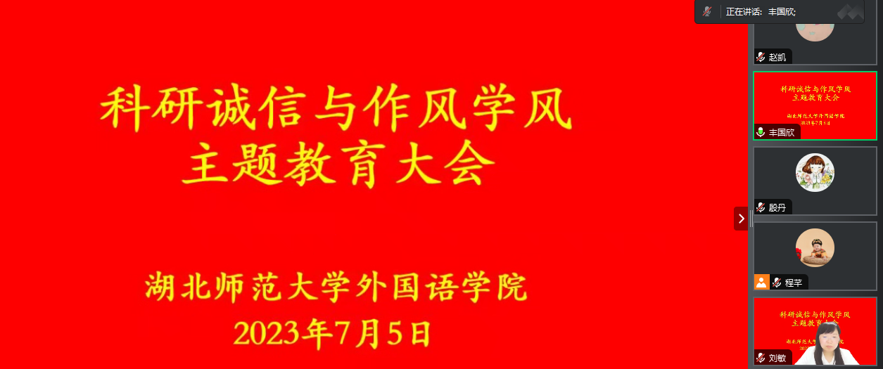 7月5日晚,成人短视频 通过腾讯会议召开科研诚信与作风学风主题教育大会。成人短视频 党委书记王海燕、院长刘敏、副院长项军平、学院全体教职工及部分研究生代表参加会议学习,会议由刘敏院长主持。