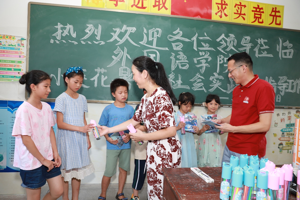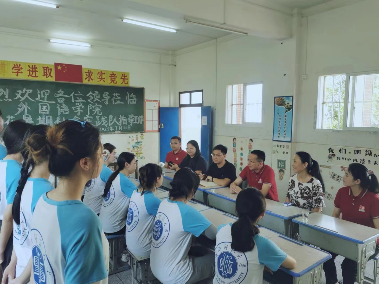 老师们走进教室和宿舍,零距离了解支教大学生的工作和生活环境,亲切关心团队社会实践、支教活动、衣食住行等方面的情况。随后,领导老师们与支教师生进行了座谈,师生代表分别结合各自实际谈了参加支教活动以来的收获、工作重点以及生活学习中面临的困难。校团委书记刘晓光充分肯定了暑期社会实践活动的意义和小葵花工作队的成效,并对实践队的同学们提出了两点希望:一是希望同学们珍惜这次实践机会,发挥自身专业优势,在做中学,在学中做,多总结多反思,不断提升自身素养。二是希望同学们时刻保持“自找苦吃”的精气神,严格遵守纪律要求,以身作则,服从指挥,展现青春风采,发扬团结协作的精神,切实做好支教工作。团市委干部张冰强调,同学们要强化安全意识,守住安全底线,在实践过程中做好小朋友的安全教育工作,同时提高个人防护意识 ,注意防暑降温。外院党委书记王海燕勉励师生一如既往发扬踏实肯干的工作作风和吃苦耐劳的精神品质,谨记各位领导们的希望和嘱托,认真贯彻落实“三下乡”活动的任务和要求,充分锻炼自己,提高教学技能,为真正走上工作岗位打下坚实的基础。实践队师生们纷纷表示,一定会好好珍惜社会实践机会,充分发扬“诚毅勤敏”的校训精神,在实践中锻炼本领,在磨砺中增长才干,以更加饱满的热情、昂扬的斗志投入实践活动中,提升自我、服务地方,为学校高质量发展贡献青春力量。
