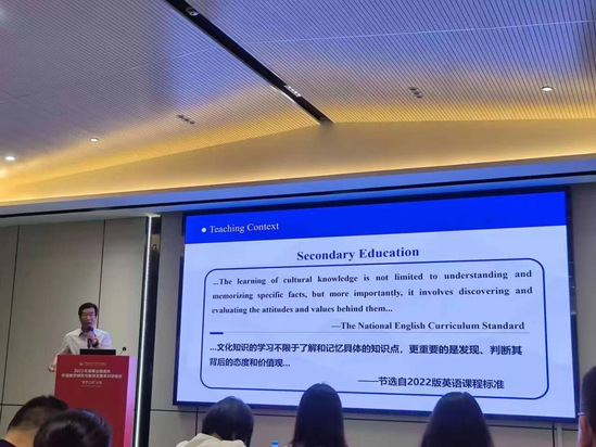 外研社“教学之星”大赛创办于2013年,在全国高校外语教学领域广受认可,是《全国普通高校教师教学发展指数(2022版)》中纳入的56项教学竞赛之一。本次大赛主题为“外语教材的有效使用:数字赋能、创新育人”,全国共有24组参赛教师团队晋级全国英语专业组半决赛。团队教师以语言与文化课程组的老师为主,以“跨文化思辨、育大国良师”为主题,秉承“四维课堂、三融三阶、数字赋能”的教学理念,以《跨文化国际传播英语教程》为教材积极备赛从研读教材入手,深入理解教材理念,结合数字赋能,挖掘选材育人切入点和语言知识焦点,从教学目标、教学流程、教学活动设计和教学评价等环节开展了多次研讨和打磨。大赛包含教学设计陈述,课堂教学展示和现场问答三个环节。现场问答环节大赛评委从理论和实践两个层面向参赛教师团队提问,全面考察教师教学理论、实践能力和课堂实操功底。