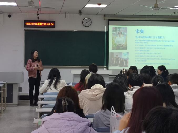 来自广州市增城区荔湖城外国语学校的宋爽校友以“日语教师的教育情怀与职业技能培养”为题给同学们带来了精彩的讲演。她指出,身为一名教师需要热爱教育事业、热爱学生、追求卓越、终身学习,同时还要有扎实的专业知识,一专多能是对新时代教师的最新要求。同时,从事日语教师职业还需要具备外语能力、写作能力、语言表达能力、沟通能力、情绪管理能力等多方面的能力,为同学们今后的日语教师成长道路指明了前进方向和奋斗目标。