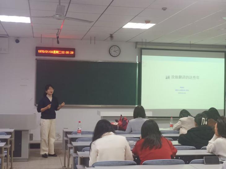 来自武汉东风本田汽车有限公司的李淑珍校友,首先分享自己的求学、工作经历。随后她从在从事日语翻译工作的实际经历出发,把自己在工作中的遇到的各种困难、以及如何克服困难,实现蜕变等过程给同学们进行了逐一介绍。她鼓励同学们,万事开头难,但是只要坚持努力,就一定能够实现跨越和升华。更为难得的是,她还将自己工作中使用的翻译材料样本展示给同学们,让大家对日语翻译工作也有了更加全面的了解。