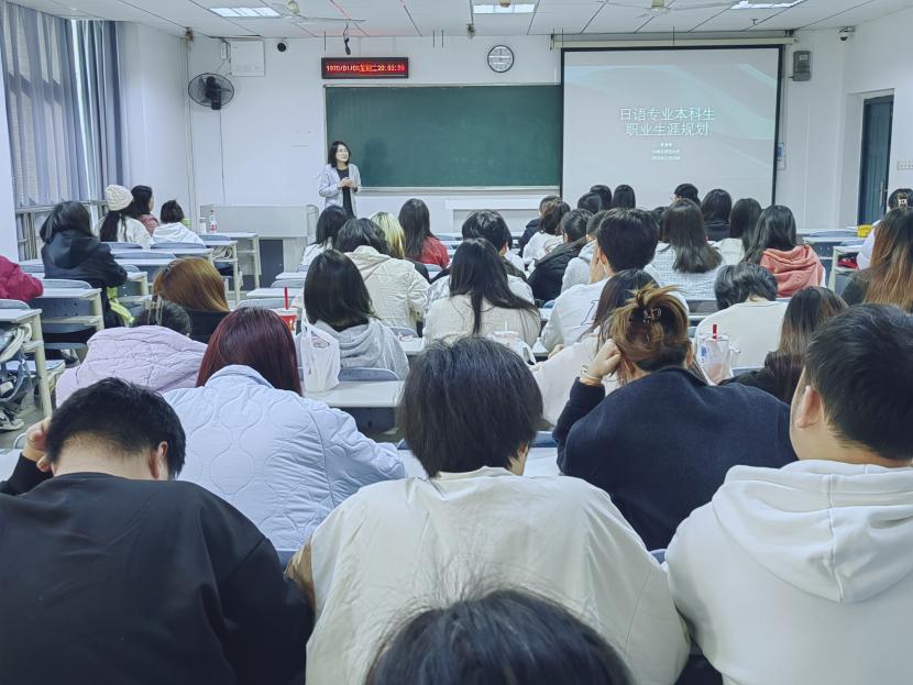 来自株式会社ALPHA未来的陈金丽校友给同学们分享了自身求学、赴日留学以及在日本创业的经历。介绍了她个人对日语学习的认识、本科阶段的职业规划、赴日升学的途径、在日本就职的流程,同时也谈到了她对日本社会和日本人的认识等等。她指出,日语学习需要输入与输出同步、需要日积月累。她的讲解使同学们对赴日留学、对日本社会发展动态有了更深入的了解,对于今后的职业生涯规划也有了更加深刻的认识。