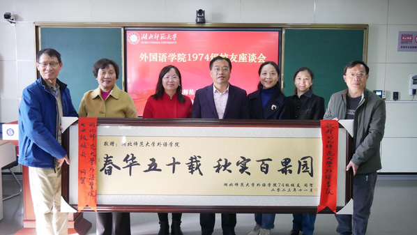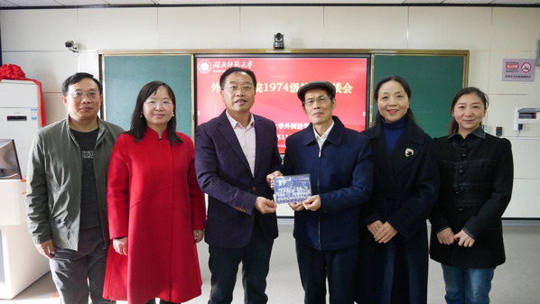 随后,校友们向母校外院赠送了纪念牌匾和1974级29名学生与学校领导以及外语系老师们的珍贵毕业合影。