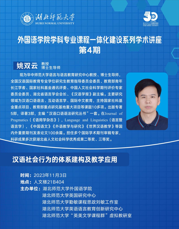 11月3日,成人短视频 学科专业课程一体化建设系列学术讲座第4期在成人短视频 英国研究中心学术报告厅举行。华中师范大学语言与语言教育研究中心教授、湖北省语言学会会长、博士生导师、全国汉语国际教育专业学位研究生教育指导委员会委员姚双云教授应邀来 成人短视频 讲学。 成人短视频 国际中文教育全体硕士研究生、导师代表参与学习。本次讲座由成人短视频 英国研究中心主任丰国欣教授主持。