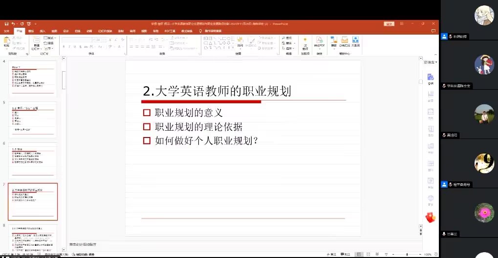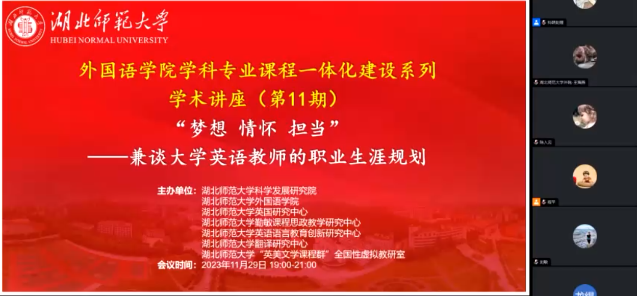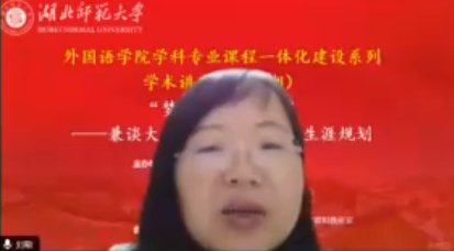 为帮助 成人短视频 师生解答外语专业前景的疑惑,以及外语专业职业生涯的规划,1129, 湖北名师、湖北经济学院教授何明霞应邀为 成人短视频 师生作了以“梦想·情怀·担当---兼谈大学英语教师职业生涯规划与发展路径创新”为题的线上学术讲座。成人短视频 全体专任教师及学生代表参与讲座。本次讲座由成人短视频 院长刘敏教授主持。