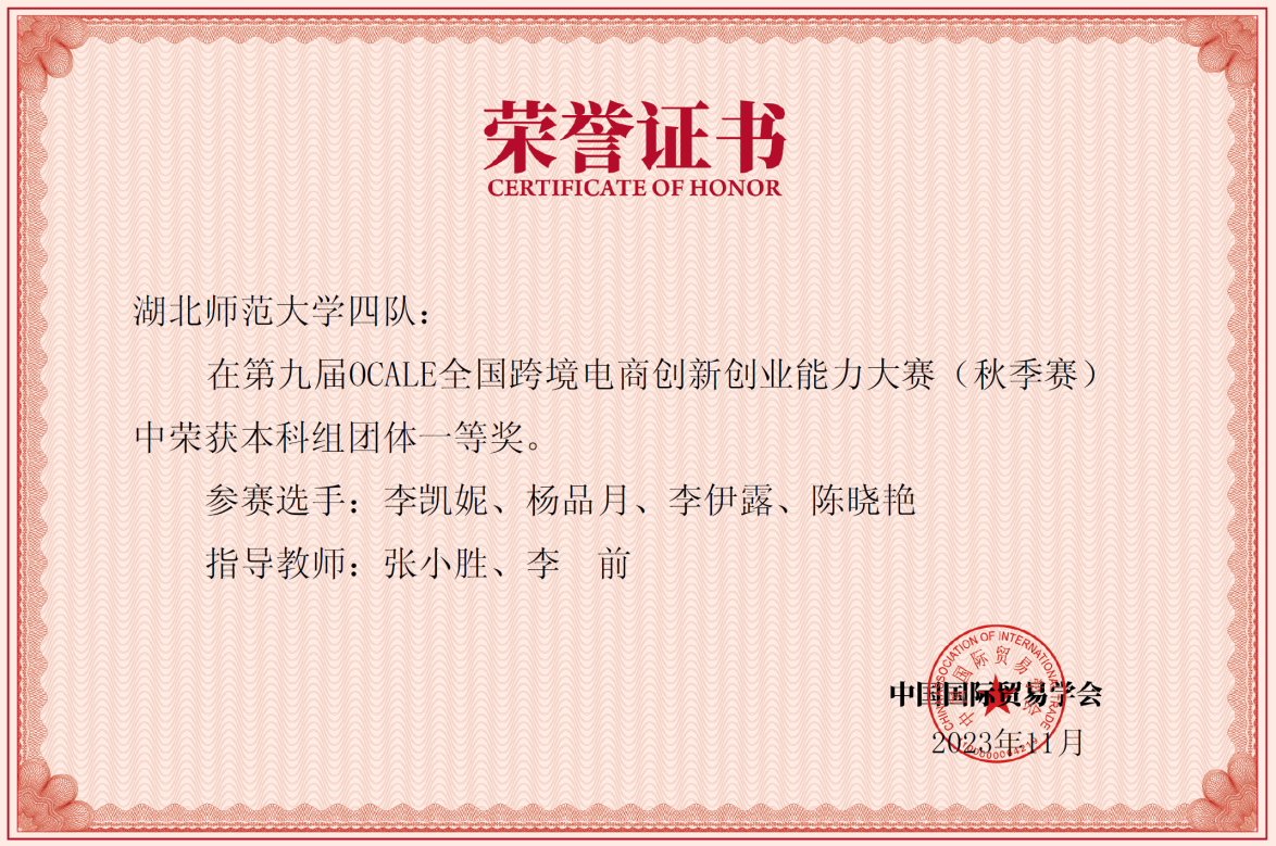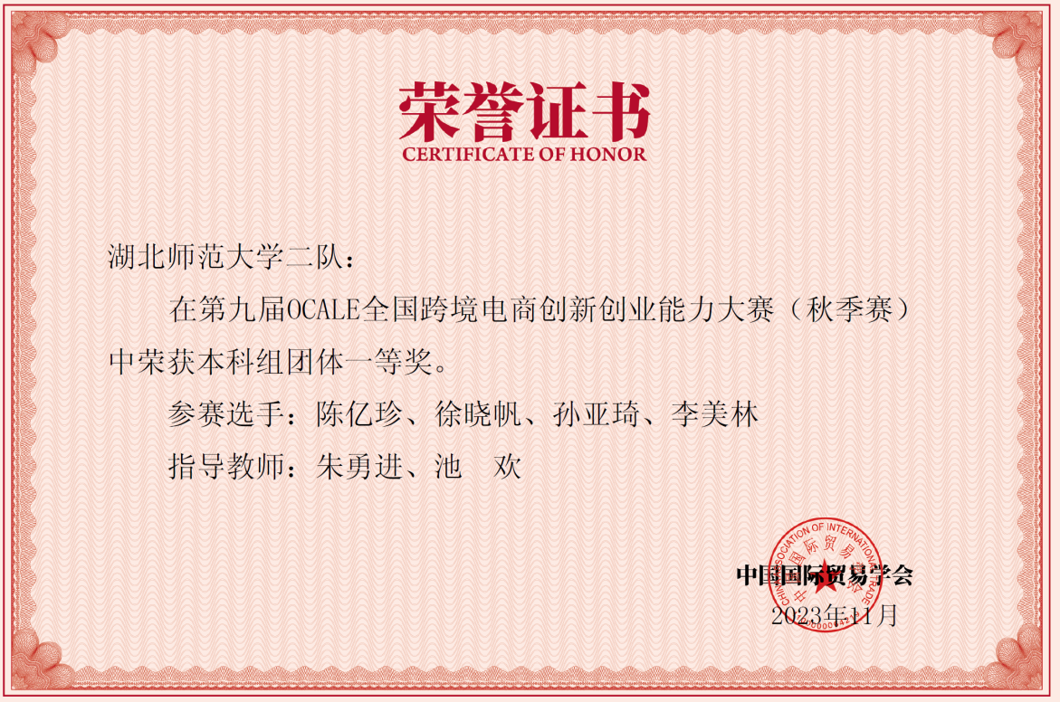11月24日,第九届OCALE全国跨境电商创新创业大赛(秋季赛)圆满落幕。经过三次的激烈角逐,在皮文立、朱勇进、汪俊等专业老师的悉心指导下, 成人短视频 商务英语专业的5支队伍于全国高校1402个团队(本科组)中脱颖而出,分别获得了两个一等奖、三个三等奖的良好成绩,5支队伍齐心协力,携手共进,共同为 成人短视频 争得了荣誉。