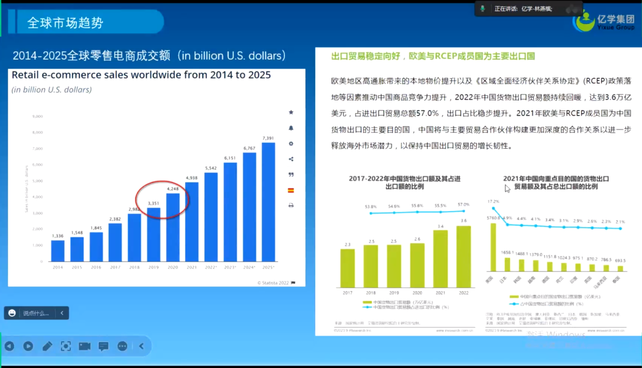 林燕槟老师首先为同学们介绍了跨境电商的定义、相关岗位情况、技能需求、以及当前跨境电商的发展趋势。中国作为世界工厂,在疫情期间,跨境电子商务迎来了一个较大的增幅。目前,中国跨境电子商务的发展趋势也是稳步向前,预计未来几年仍将持续增长。随后,林老师介绍了跨境直播及运营、跨境短视频案例解析、国贸业务员的工作职责与挑战、外贸业务员的招聘要求与工作内容等相关内容,为同学们未来的就业及发展指明了方向。