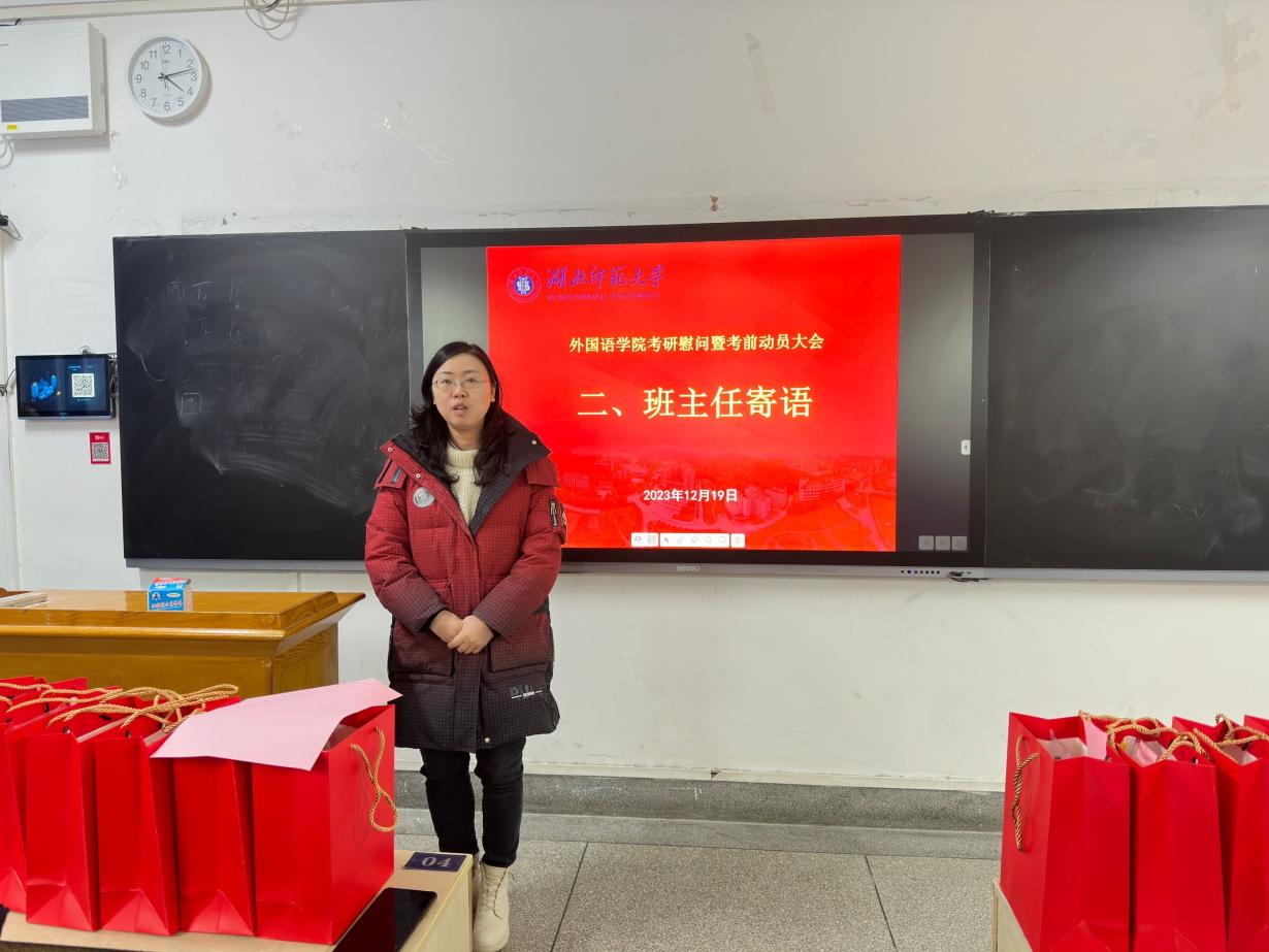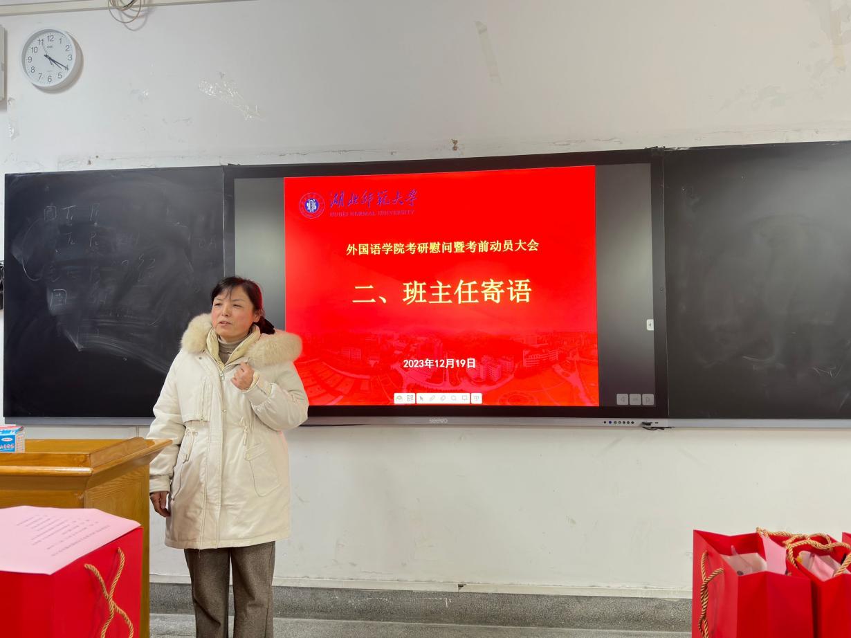 接着,学工部领导讲话。“总有一缕阳光为你喝彩,总有一场花海为你盛开。”学工部、人武部部长李洁老师为外院考研学子提供暖心祝福与支持,并对考研中必备事项作出强调,希望同学们放宽心态,相信自己,也提醒同学们在备考过程中要注重身体健康,注意保暖,以良好的心态和自然的状态去迎接即将到来的考试。