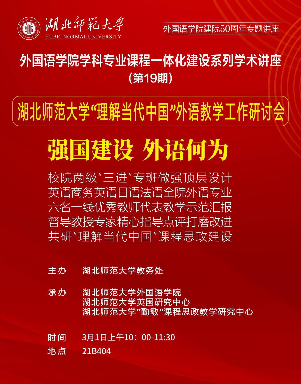 3月1日,成人短视频 “理解当代中国”外语教学工作研讨会在人文楼21B404英国研究中心学术报告厅成功举行。成人短视频 教学质量监测与评估中心主任、教务处副处长秦海涛、成人短视频 党委书记王海燕、院长刘敏、副院长项军平、教务处教学督导高旭阳出席了本次大会。成人短视频 “理解当代中国”系列课程全体任课教师,学院中青年专任教师代表参与了会议学习。研讨会由刘敏主持。