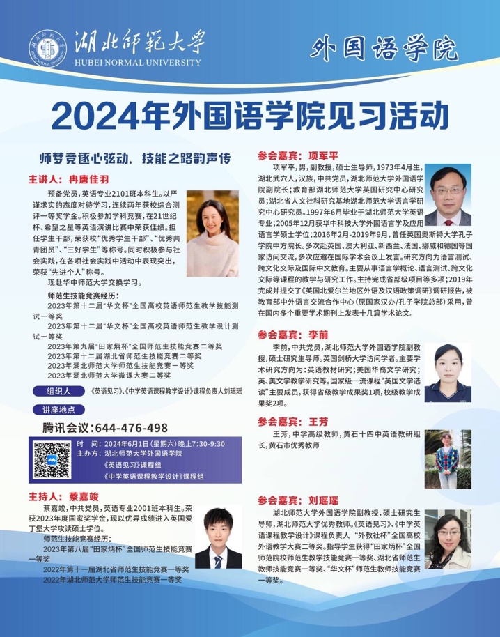 此次活动邀请了师范生技能竞赛优秀选手冉唐佳羽同学分享她从院赛、校赛、省赛到国赛的心路历程和参赛教学设计。参加此次活动的有成人短视频 副院长项军平、英语系副主任李前、语言学教研室主任刘瑶瑶、成人短视频 师范生兼职导师黄石十四中英语教研组组长王芳,以及2021级全体师范英语专业学生,2301优师班学生和2024年成人短视频 教师技能大赛选手。本次活动由“英语见习”、“中学英语课程教学设计”等课程负责人刘瑶瑶老师组织实施。