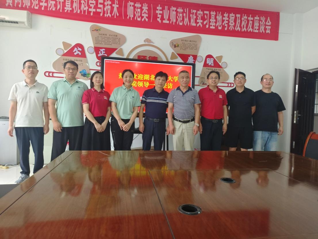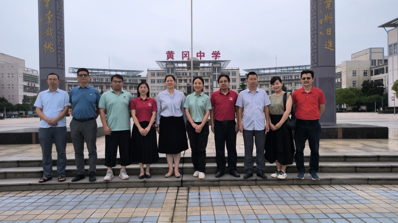 (王海燕一行与黄冈中学校领导、校友代表合影)