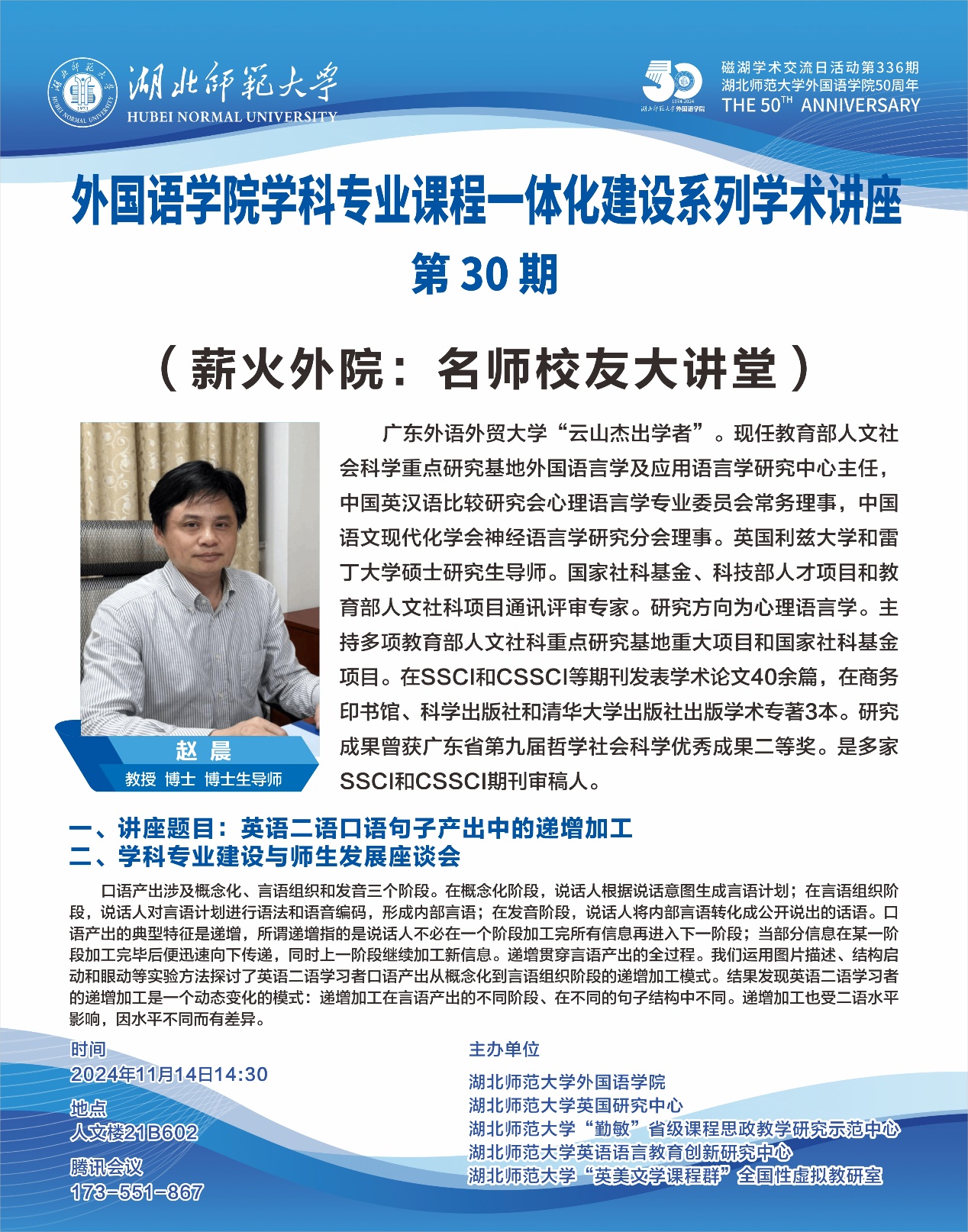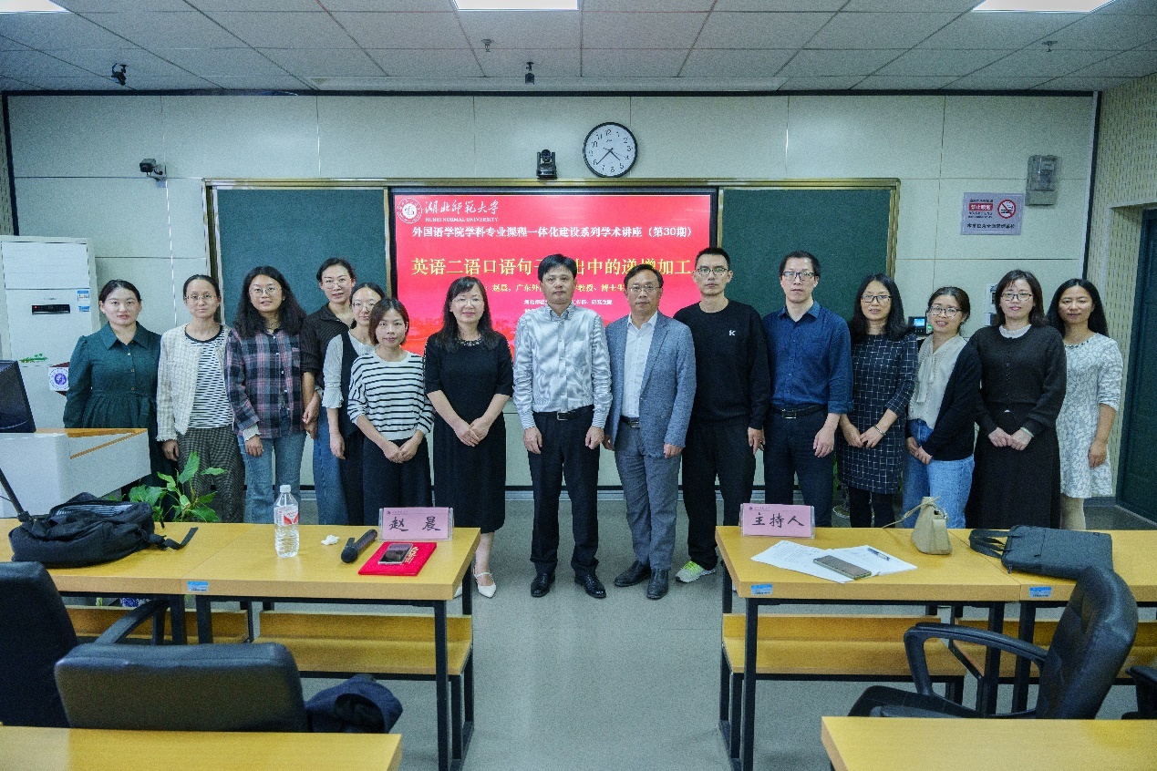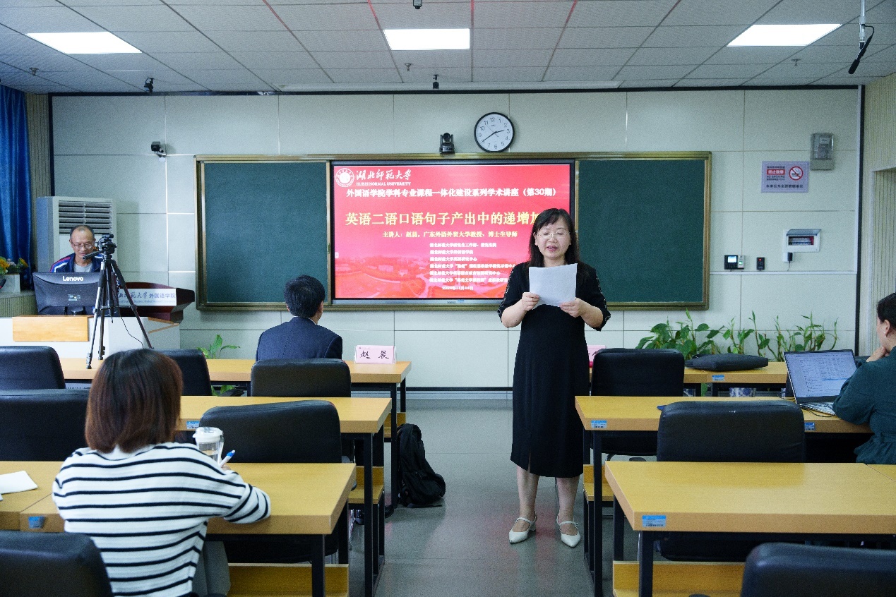 1114日下午,成人短视频 学科专业课程一体化建设系列学术讲座第30期在人文楼21B602顺利举行。广东外语外贸大学“云山杰出学者”、博士生导师赵晨教授作题为“英语二语口语句子产出中的递增加工”。 成人短视频 全体专任教师以及硕士研究生代表参与讲座,本次讲座通过腾讯会议线上同步直播。讲座由成人短视频 院长刘敏主持。