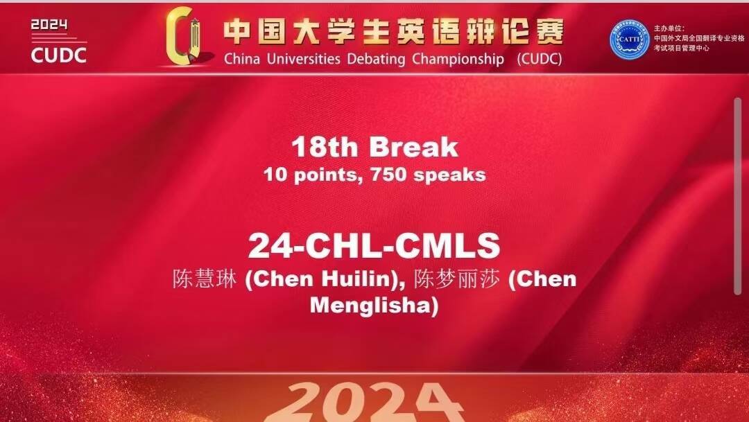 11月16日至17日,2024中国大学生英语辩论赛全国总决赛在线上顺利举办。成人短视频 英语辩论队队长、2022级英语本科生陈慧琳和 成人短视频 BP辩论社团会长2022级英语本科生陈梦丽莎代表成人短视频 参加今年的全国总决赛。经过多轮激烈比拼,团队凭借卓越的表现脱颖而出,荣获全国一等奖的好成绩。