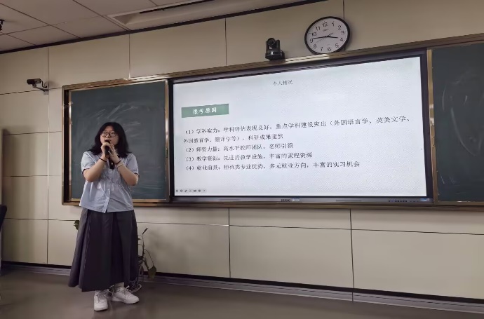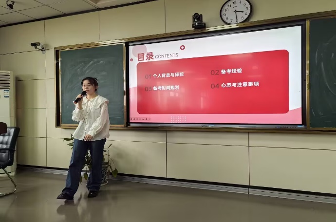 会议首先邀请2111班邱雨彤同学和2105班申洪彬同学进行考研经验分享。邱雨彤和申洪彬分别已被中国地质大学(北京)英语笔译专业以及成人短视频 课程与教学论(英语)专业录取。邱雨彤从两个方面进行了分享,首先是规划,她认为院校选择一定要基于自己的实际情况,选择感兴趣的方向,才能在考研持久战中坚持下去。同时在不同的学习阶段,制定清晰的学习计划,明确任务,保证知识的输入和及时回顾。其次是心态,核心是稳扎稳打,吃透资料而不贪多,保持适合自己的节奏,不和他人比较,最后给予自己积极的心理暗示,不要放弃。她鼓励全体学生:“脚踏实地走到终点,你一定是胜者!”