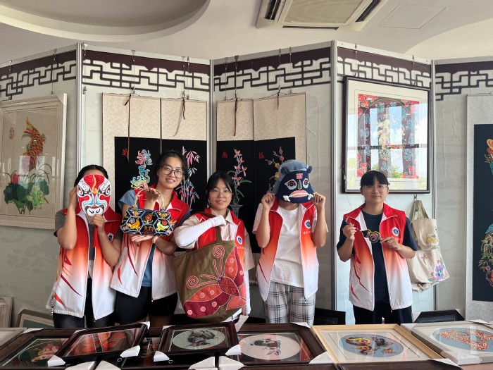 实践队自公交站启程,辗转抵达首站阳新文化馆。踏入馆内,馆长化身 “文化引路人” ,带领满天星实践队穿梭时光。“阳新老八景” 水墨间勾勒出往昔阳新风光;渔网渔具虽已斑驳,但渔歌与风声似在耳畔回响;阳新传统农具静静陈列,触摸间,先辈耕耘的温度透过沧桑木石传递。戏剧排练厅内,阳新传统采茶戏演员们一唱一和、一招一式间,把乡土故事、民俗风情融入旋律演绎着传统艺术的鲜活生命力。队员们在非遗布贴中心在非遗传承人的指导下,将金线银线化作画笔,裁剪、拼贴、缝制。当第一片布贴在自己手中成型时,队员小王轻声感叹:“原来非遗不是博物馆里的标本,而是能握在手里的温度!”指尖摩挲间,队员们感知到非遗的细腻温度,解锁阳新非遗布贴的“创作密码”也让古老技艺在青春创作中焕发新活力,实现传统与现代的奇妙对话。