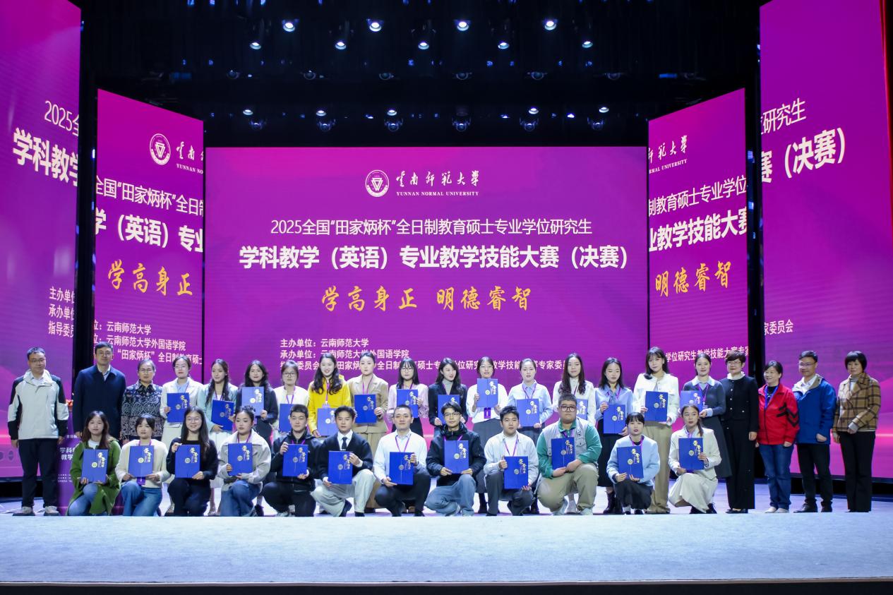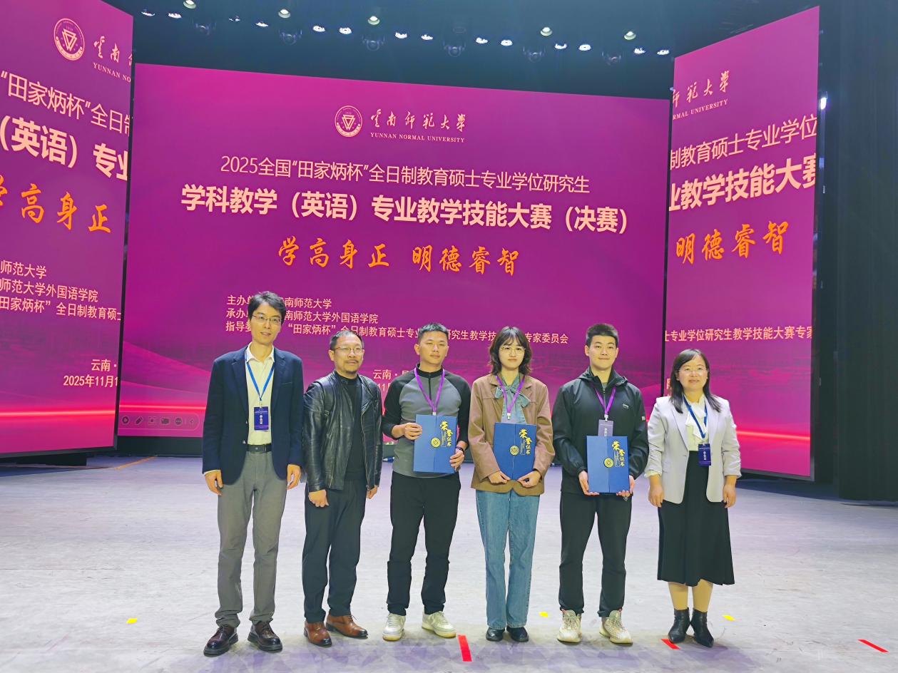 2025年11月14日至16日,2025年全国“田家炳杯”全国教育硕士专业学位研究生学科教学(英语)专业教学技能大赛(决赛)暨研讨会在云南师范大学圆满落幕。在本届赛事中,我校成人短视频 闫知否荣获全国总决赛一等奖,霍姝吉和董成标荣获优秀教学设计奖。这是成人短视频 在该项研究生全国赛事中首次有3位同学晋级入围决赛并且首次获得全国一等奖,实现了历史性突破。同时, 成人短视频 也为本届赛事湖北省高校中唯一斩获全国总决赛一等奖的院校,彰显了 成人短视频 教育硕士培养的扎实成效。硕士生导师刘敏、董志浩和伍文忠从院赛、校赛、全国初赛再到决赛,全程认真细致指导学生备赛和参赛。